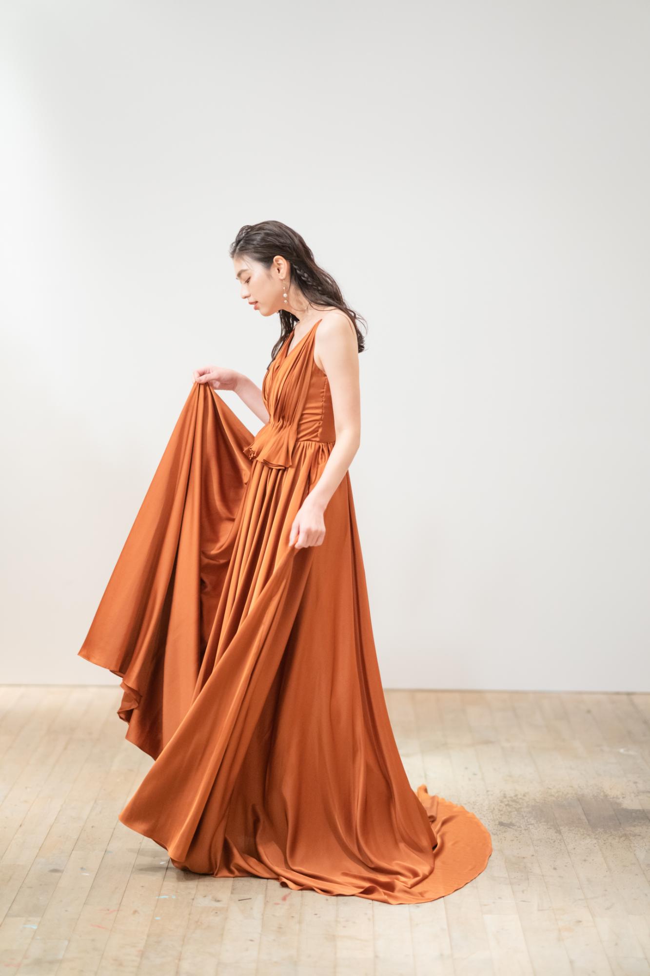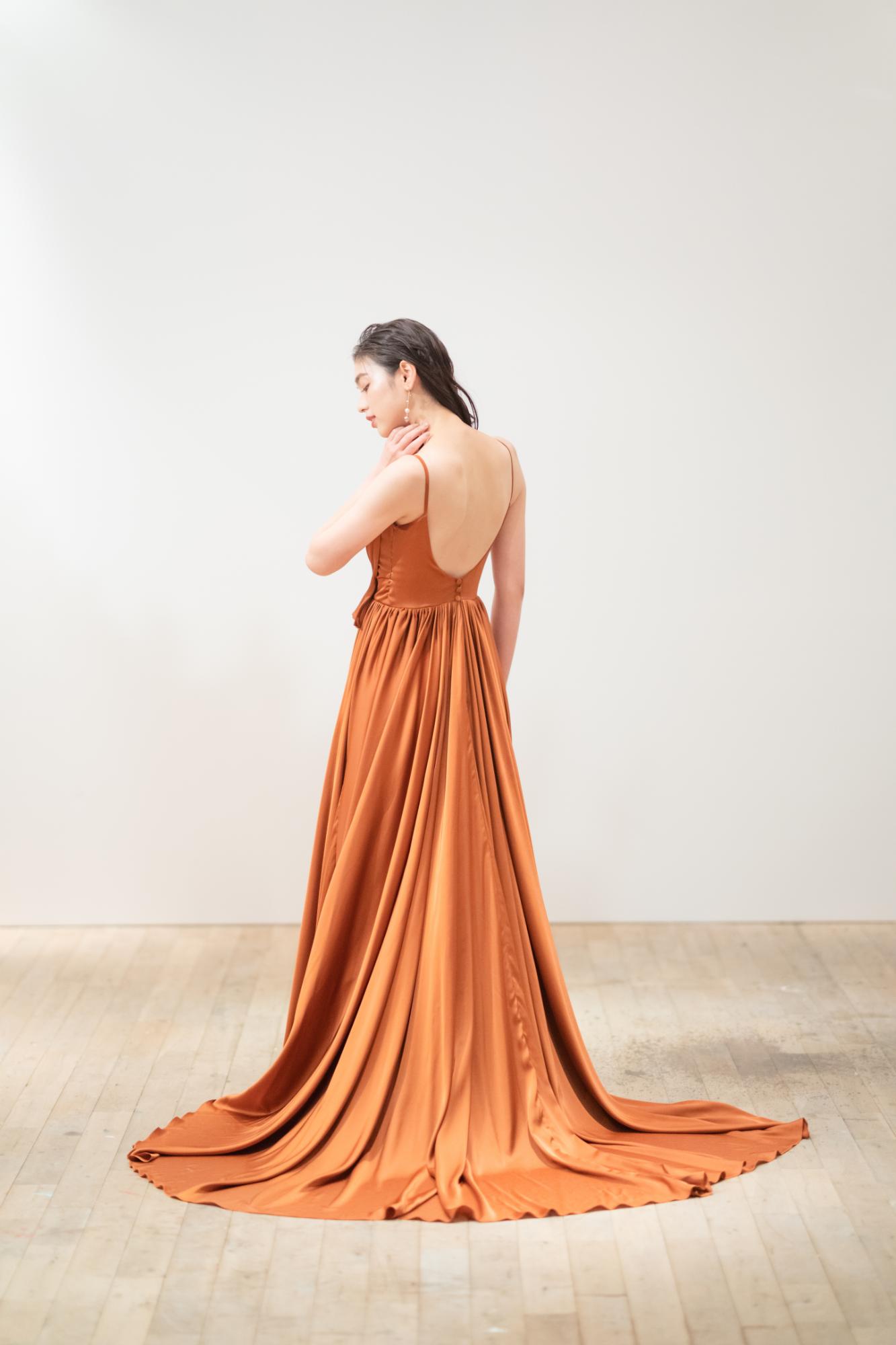 たっぷりのギャザーとなめらかなサテン生地が、歩くたび上品な揺れを生み出します。