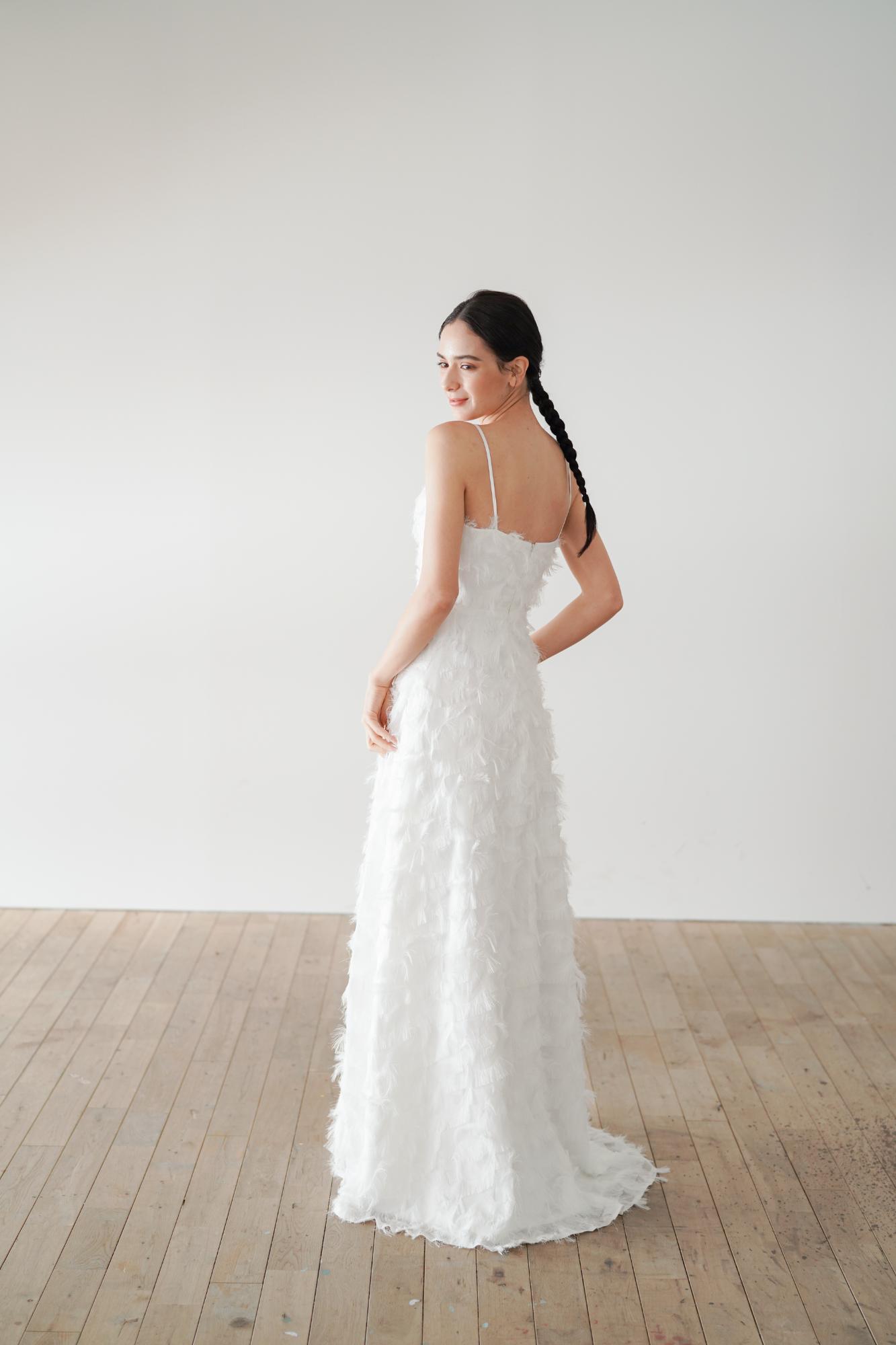 羽をイメージした素材が全身に用いられた、軽やかなデザインの一着。