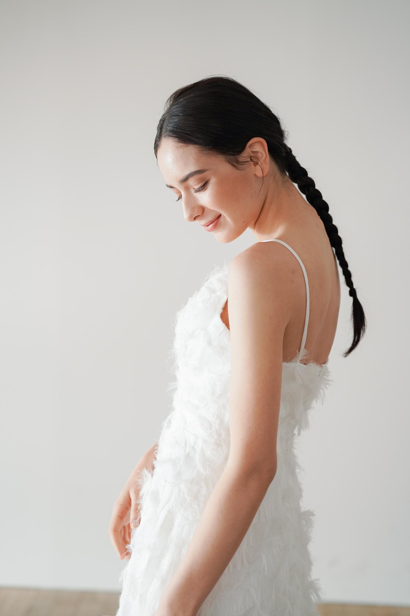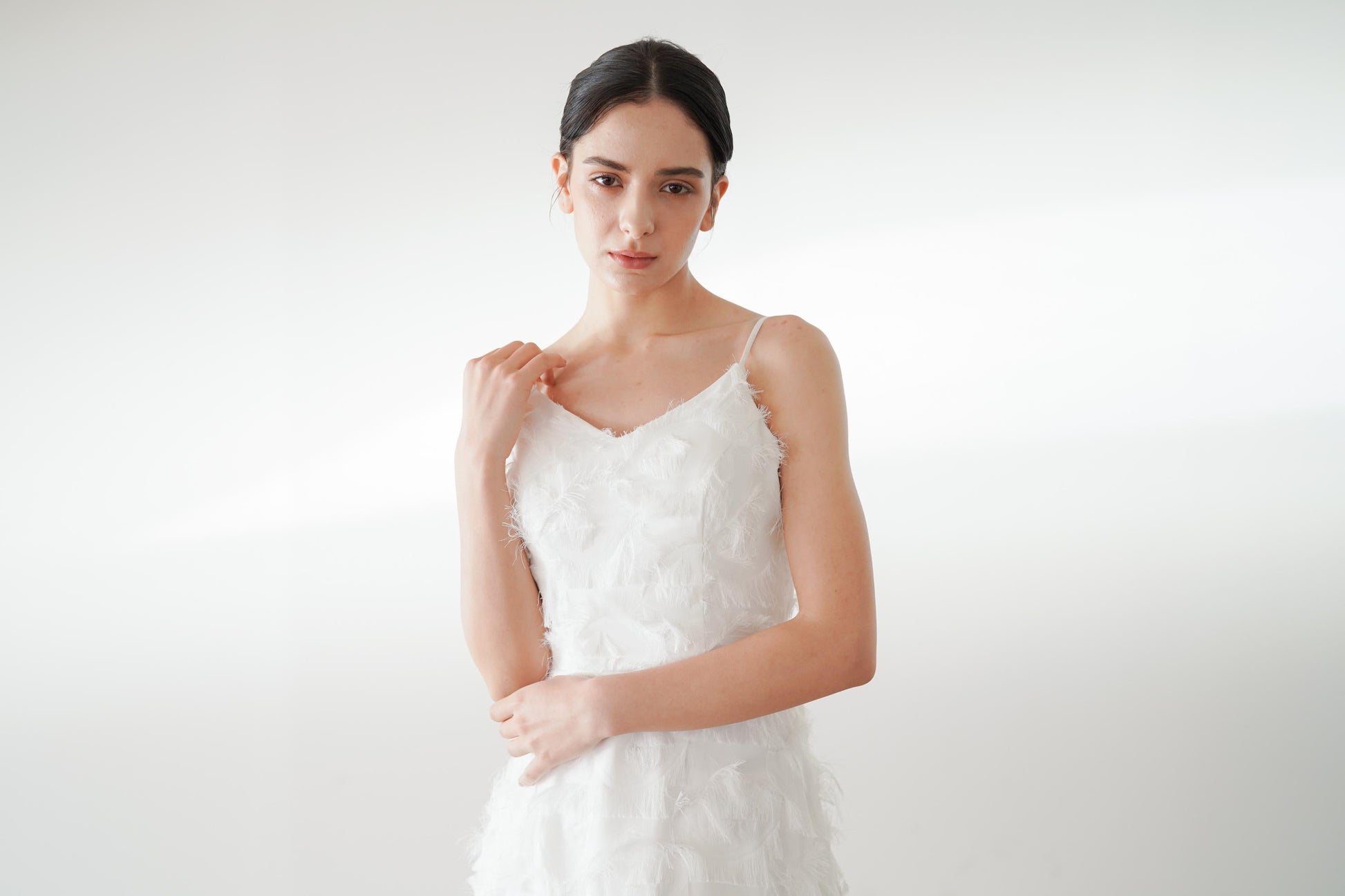 シンプルなスレンダーラインのシルエットが、フェザーライクな生地をより引き立てています。