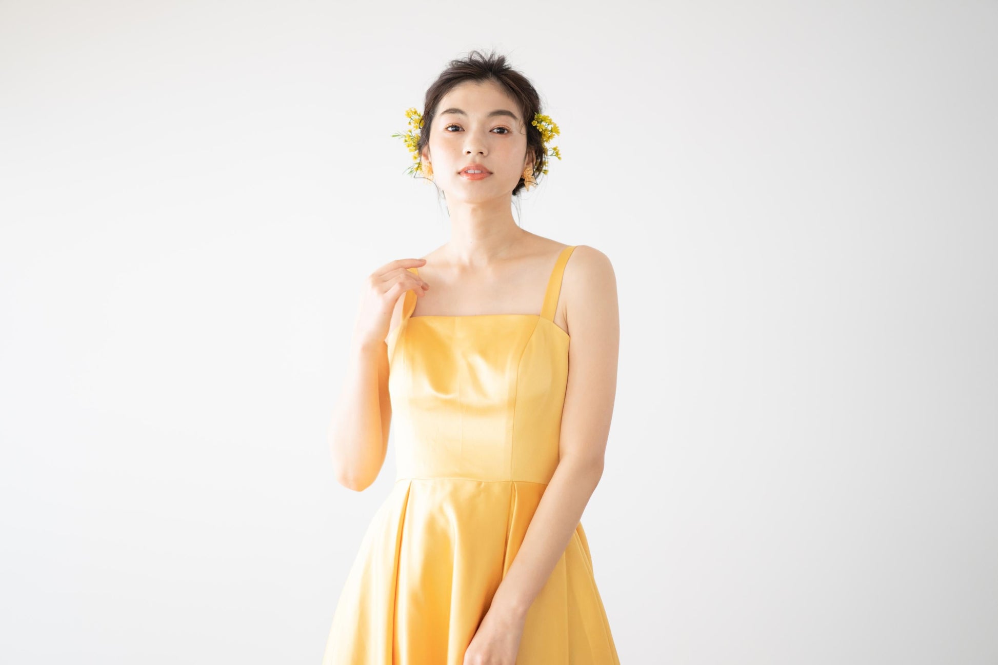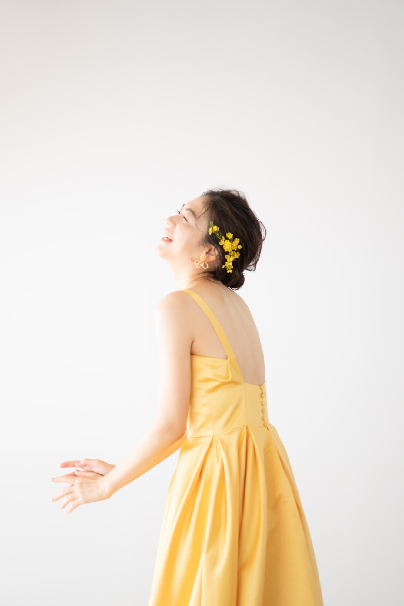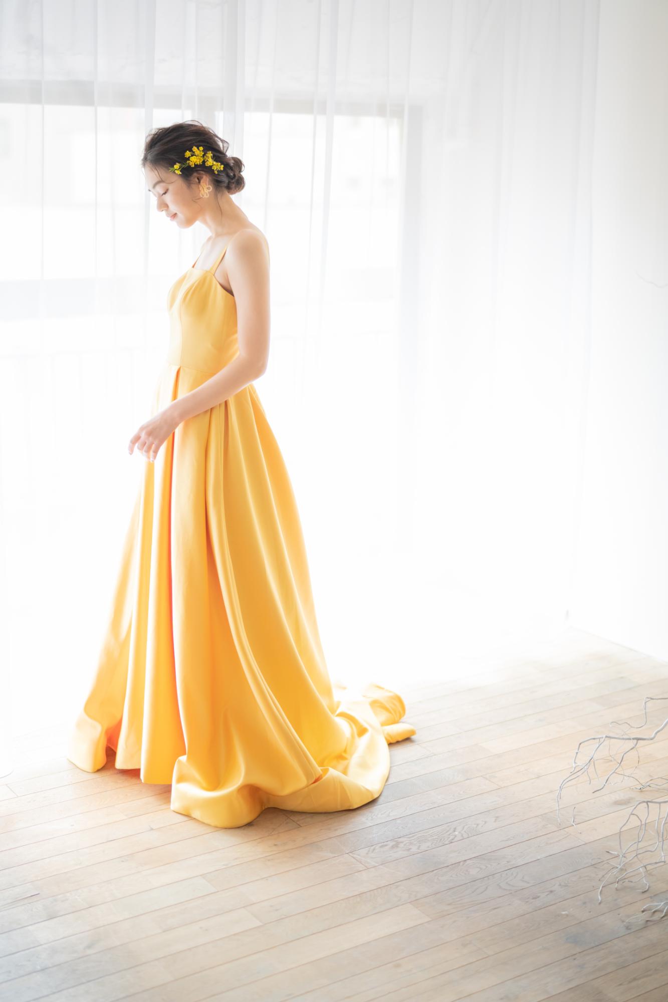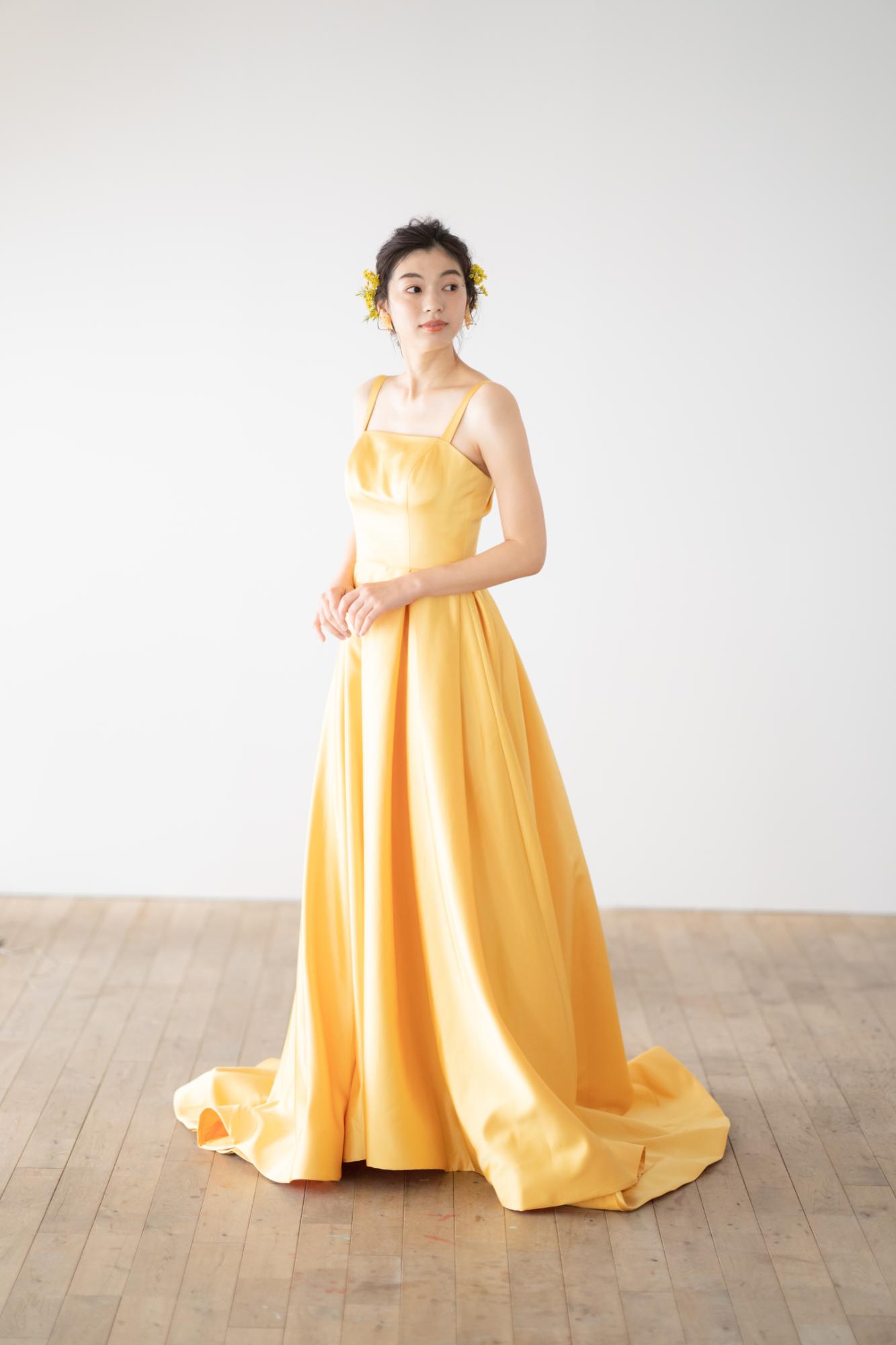 イエローのサテン生地が、太陽のようにまぶしい光沢を放つAラインドレス。
