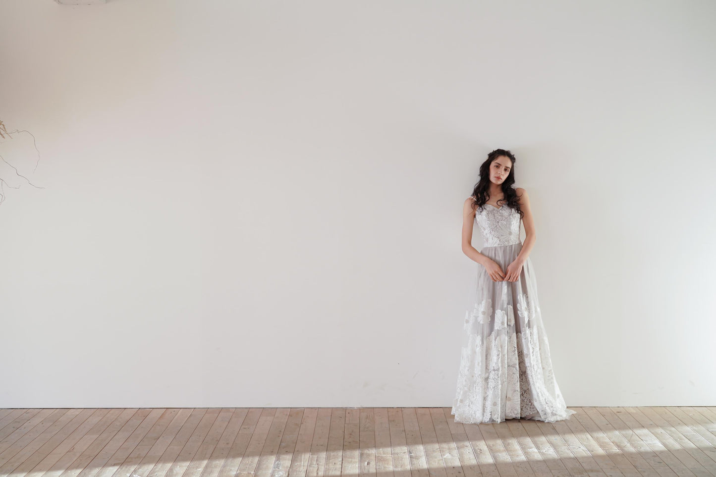 繊細で透明感のあるエンブロイダリーレースで全身をまとった、Aラインドレス。