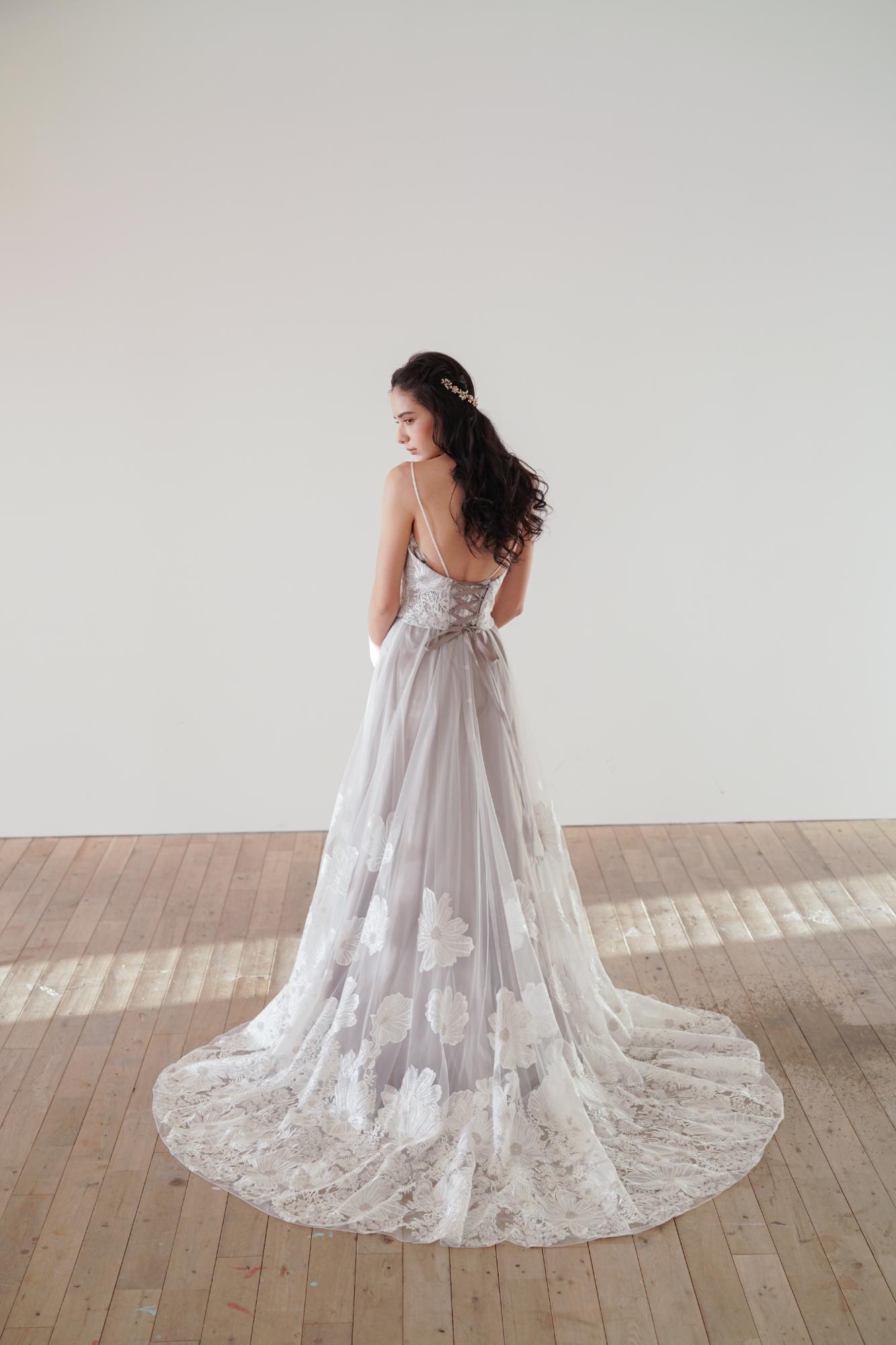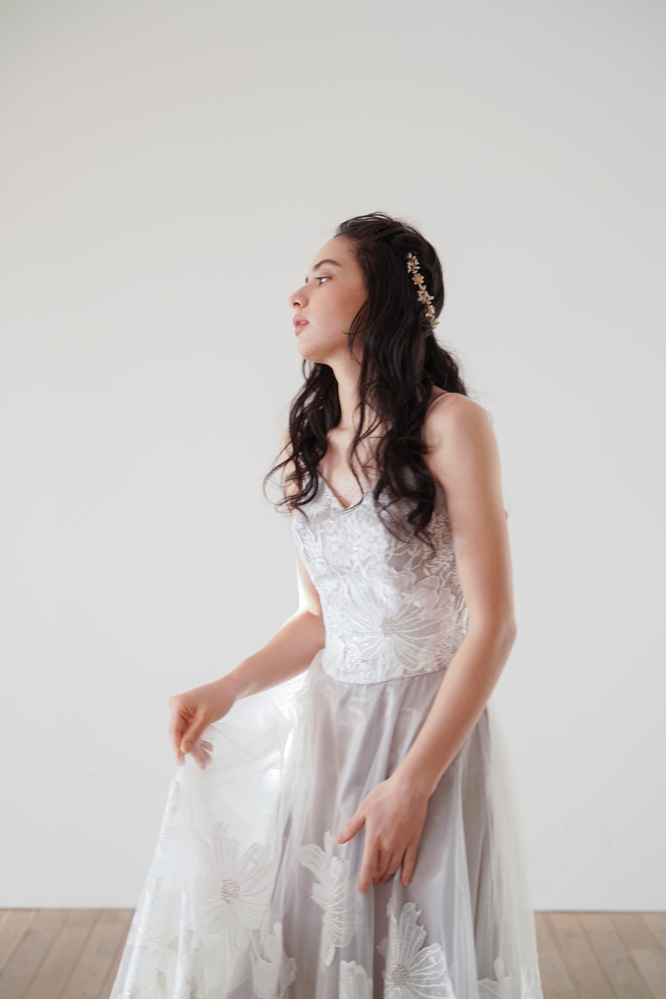 グレージュのサテンに重ね合わせられた、コスモスモチーフのレースが立体的に浮かび上がるデザインが印象的です。