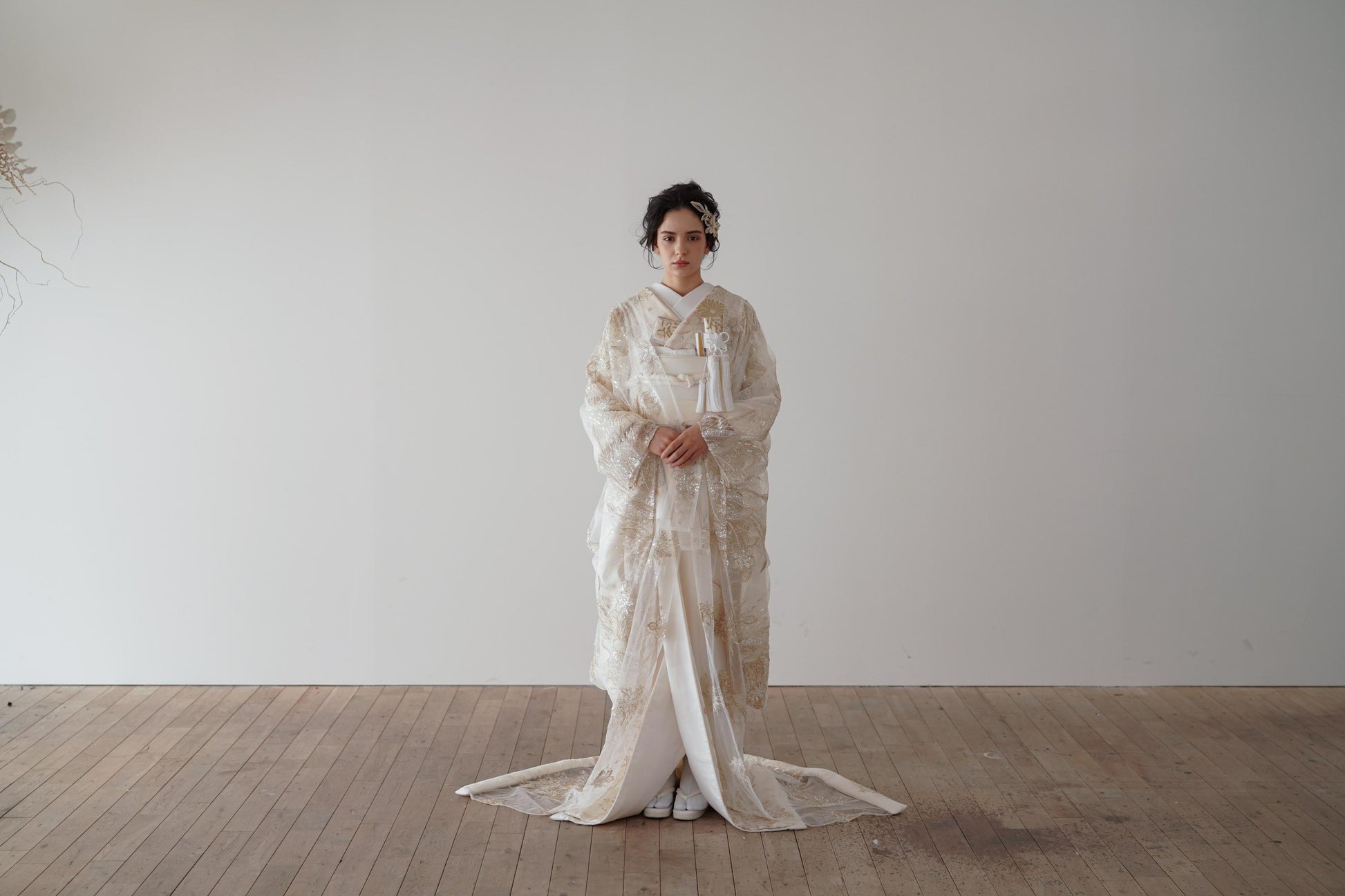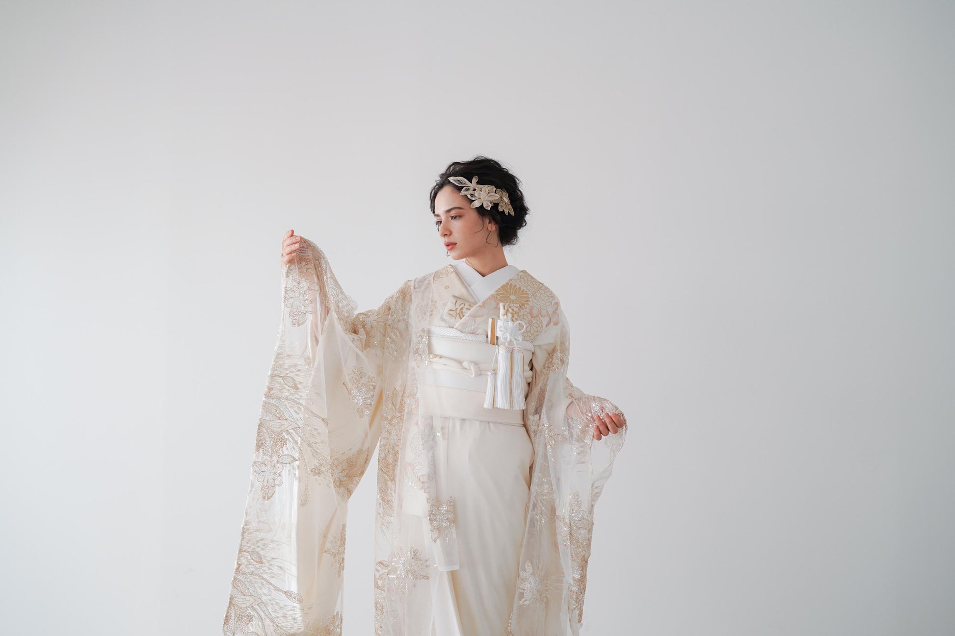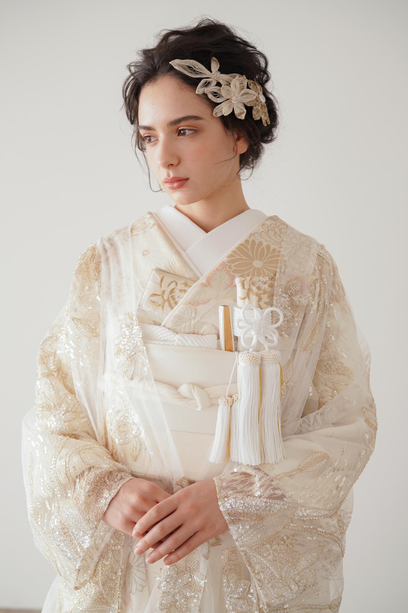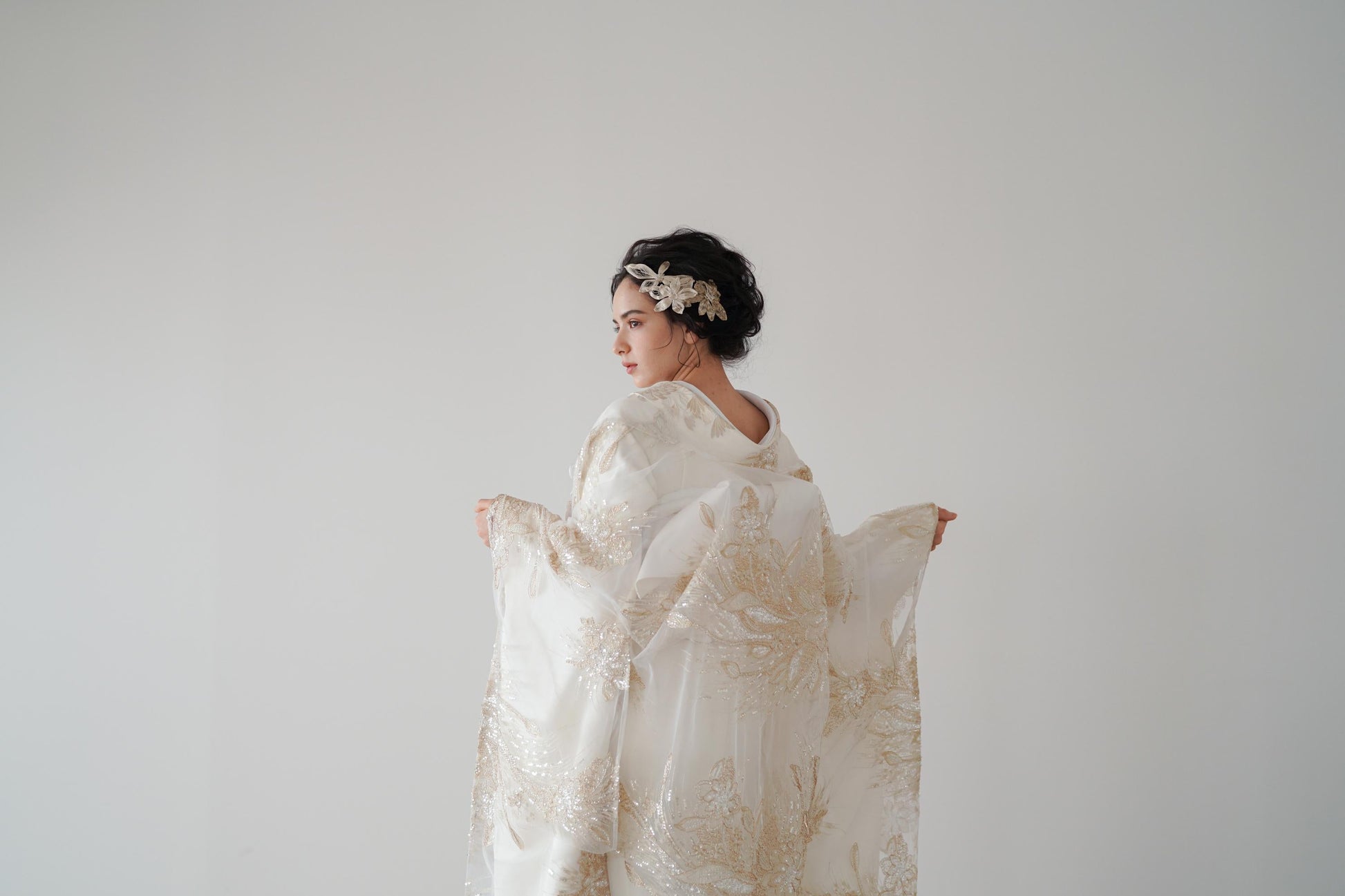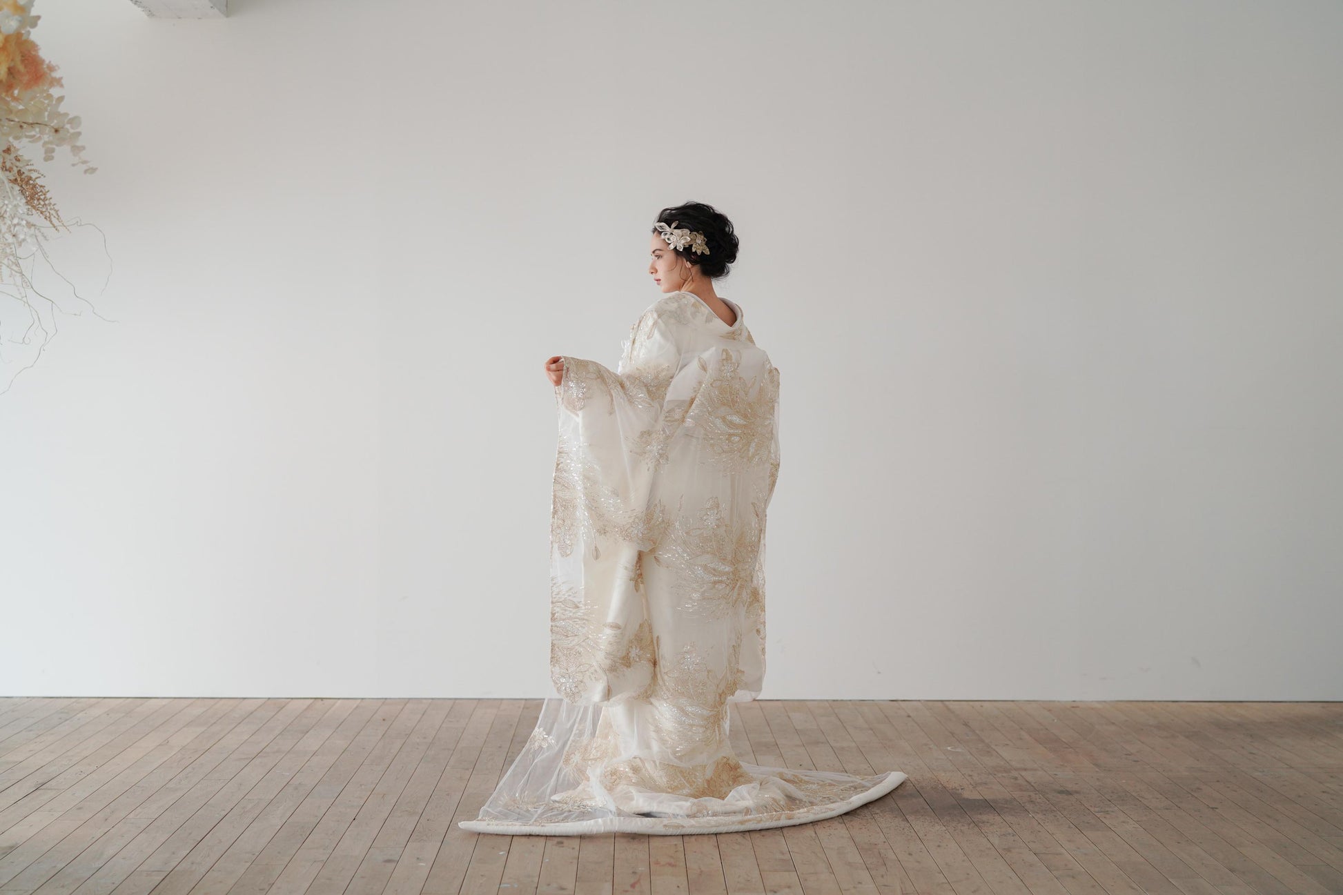 ゴールドとシルバーの糸で立体的なボタニカル刺繍が施されたインポートレースで作られた打掛。