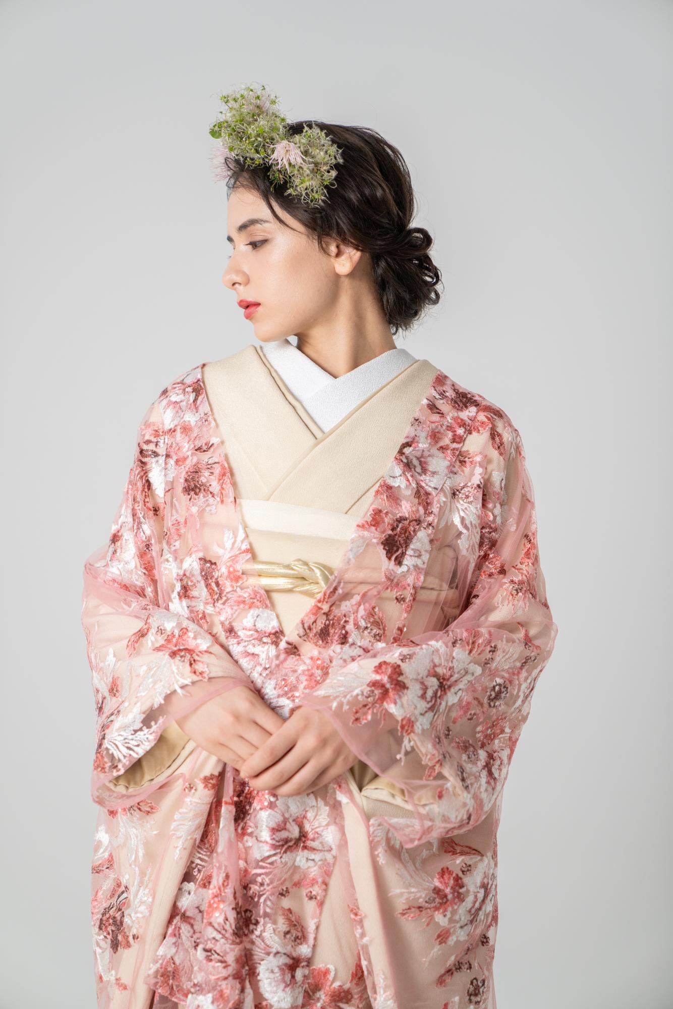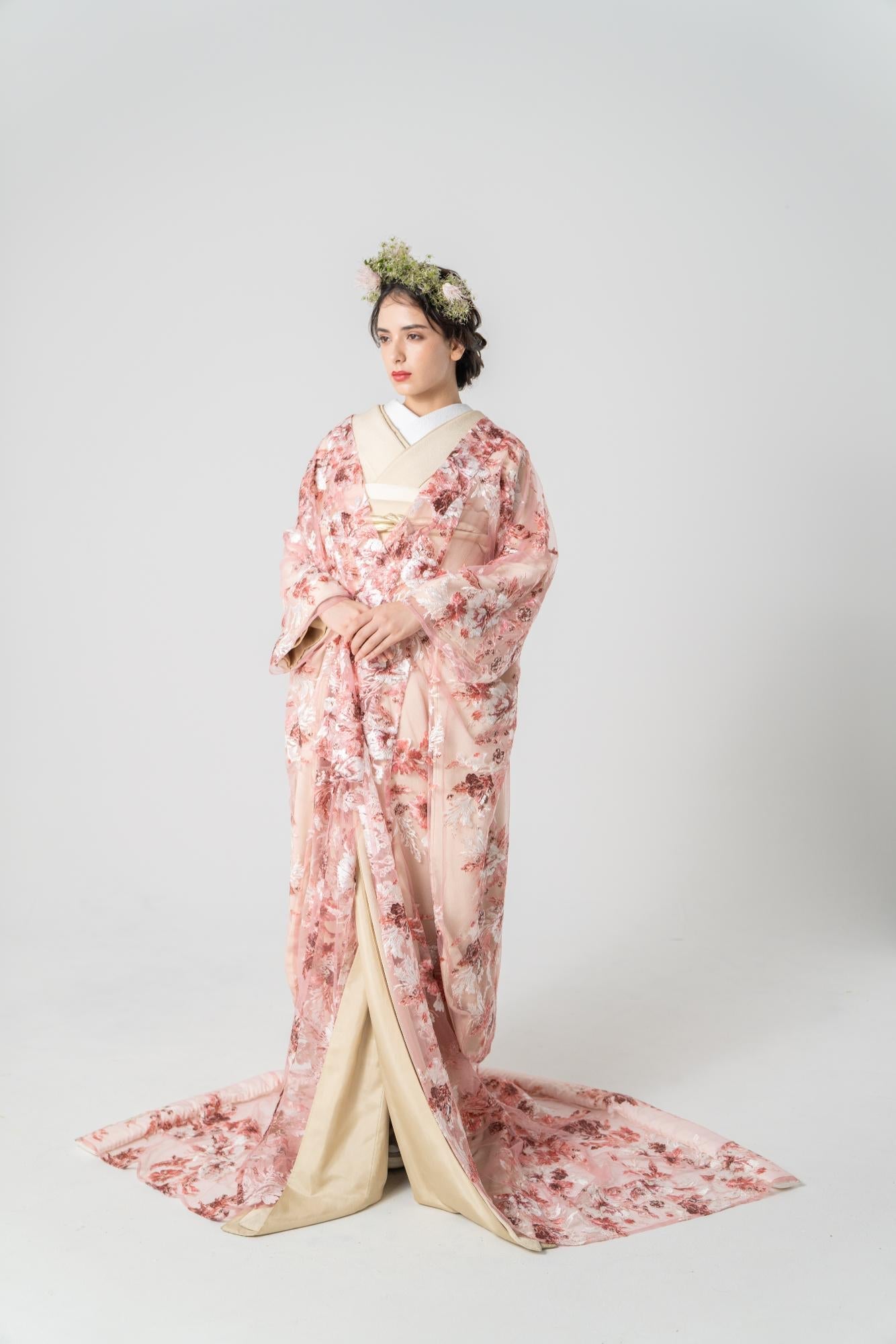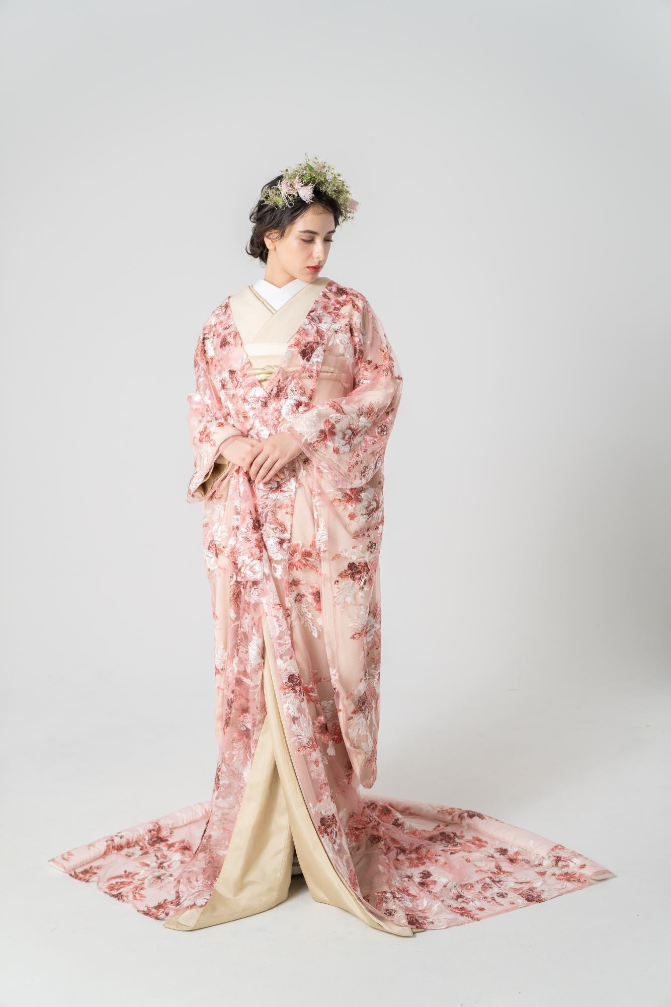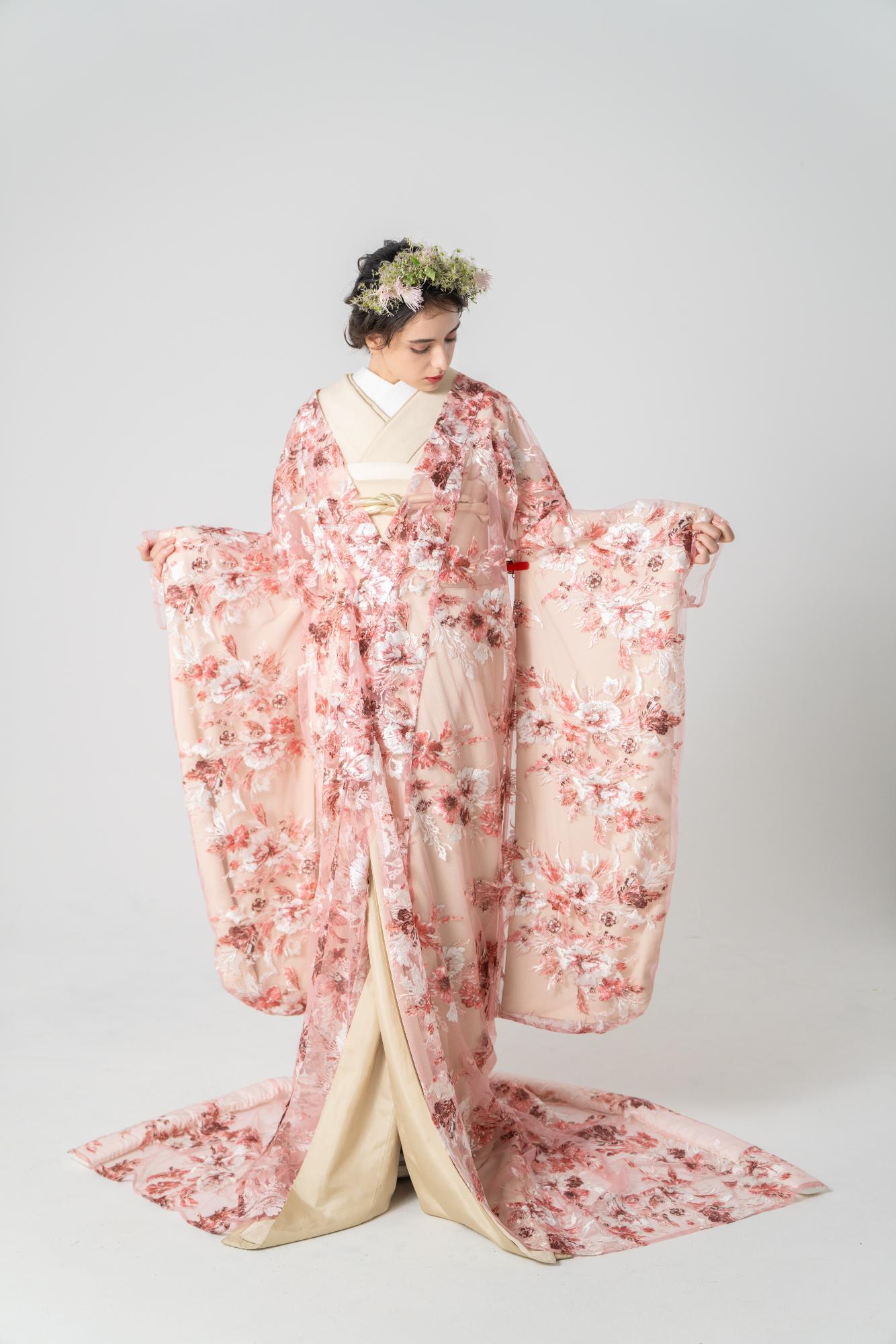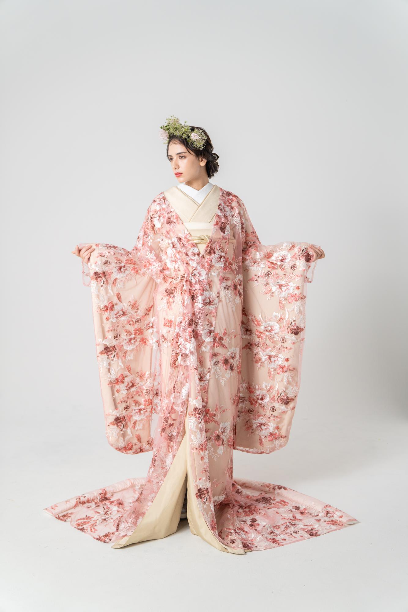 様々な色味のピンクの刺繍が美しいインポートレースを使用した打掛です。