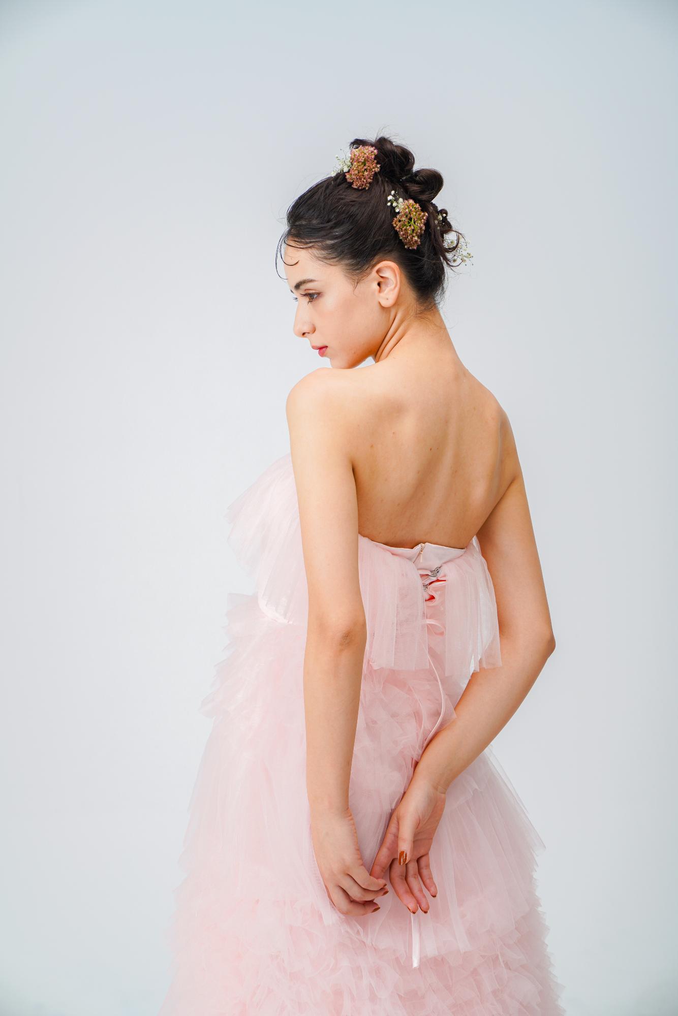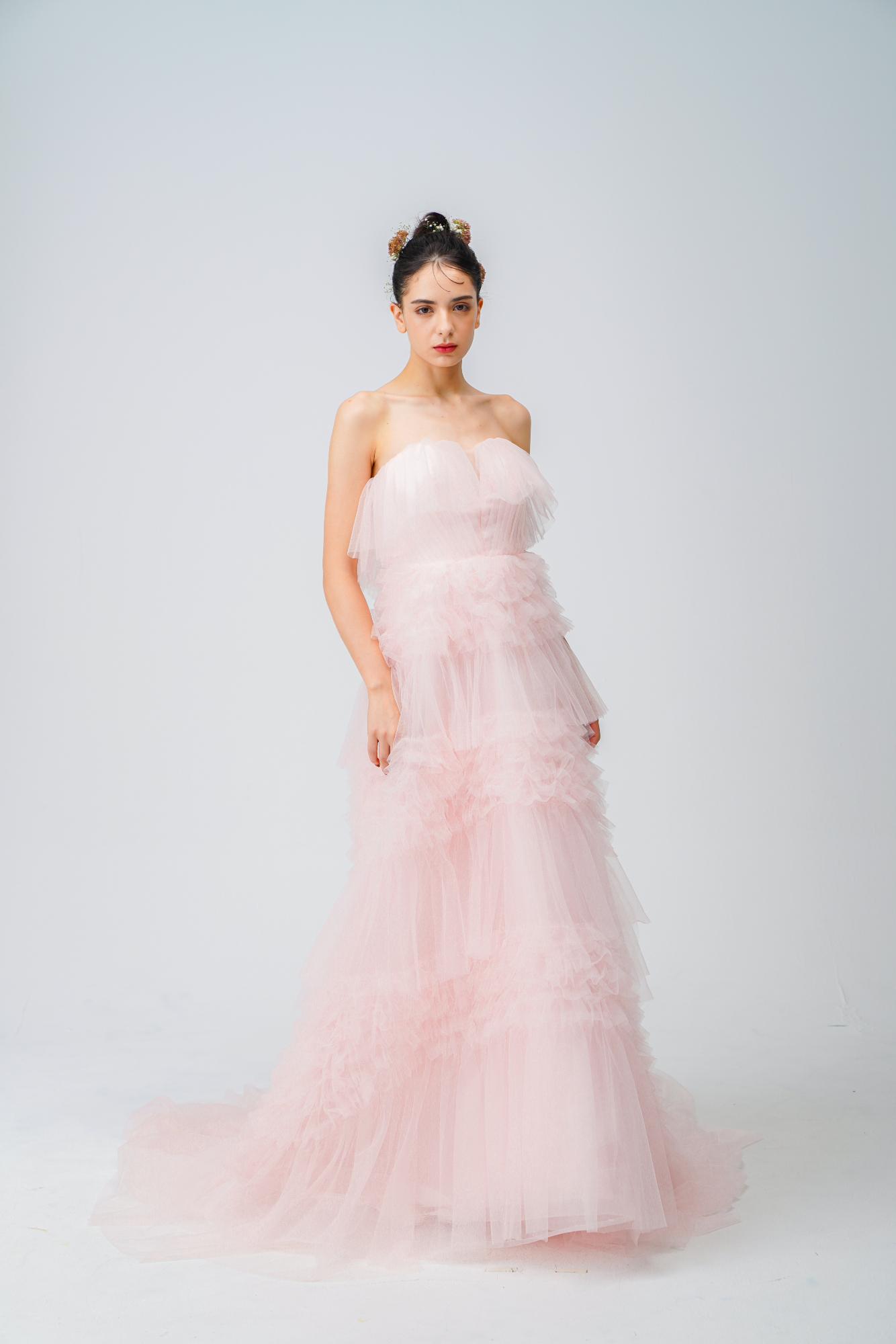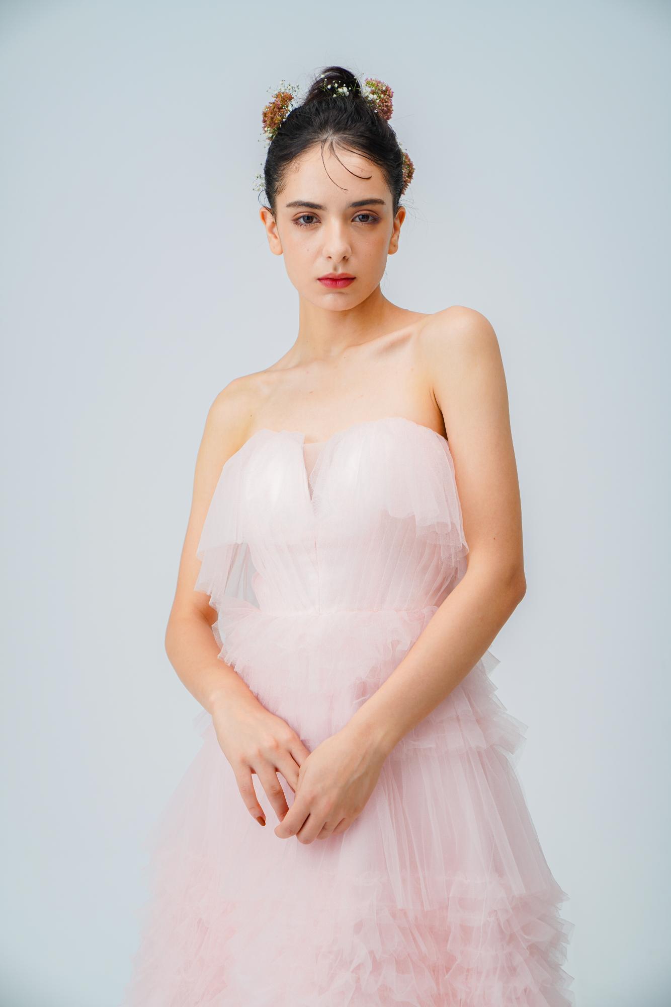 ふんわり軽やかなチュール素材×スレンダーデザインが可愛くも大人っぽいこなれ感のある逸品です。