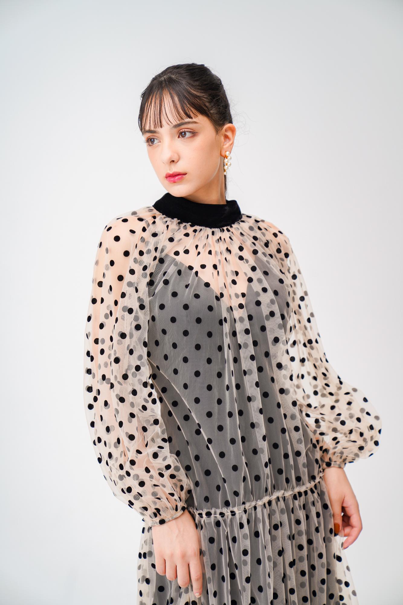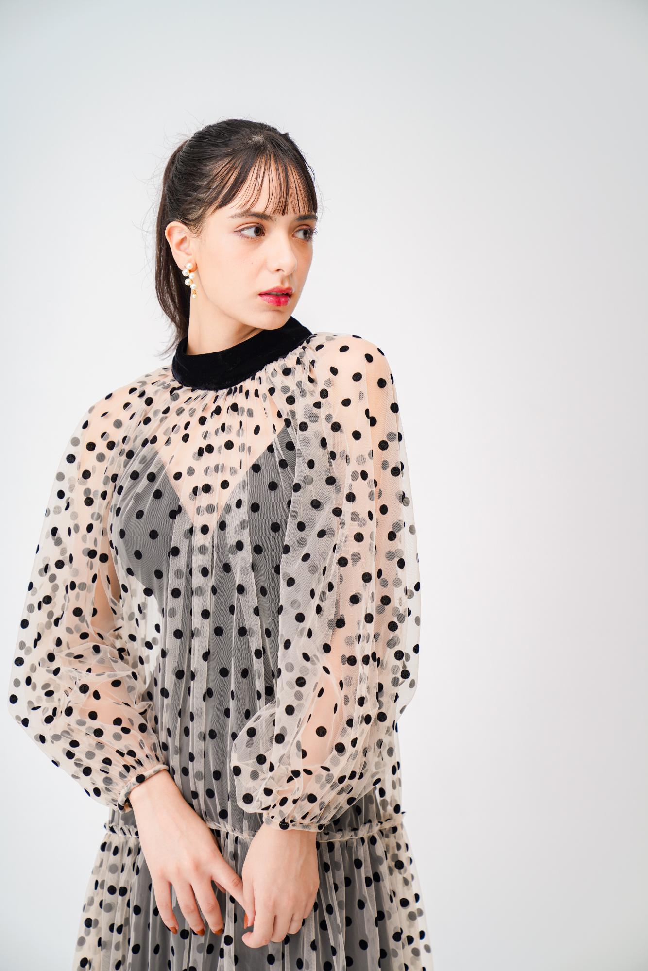 チュール素材はしなやかで、ほどこされたドット柄はベルベット調の異素材を組み合わせた風合いの為、独特でありながら愛らしくも高級感があり、バストのV字にひらけたデザインは艶やかな美しさを引き立てます。