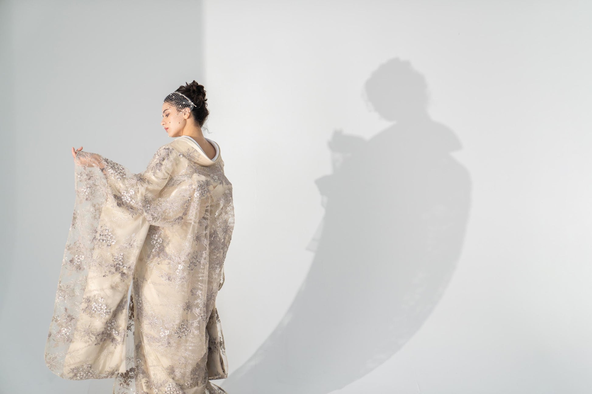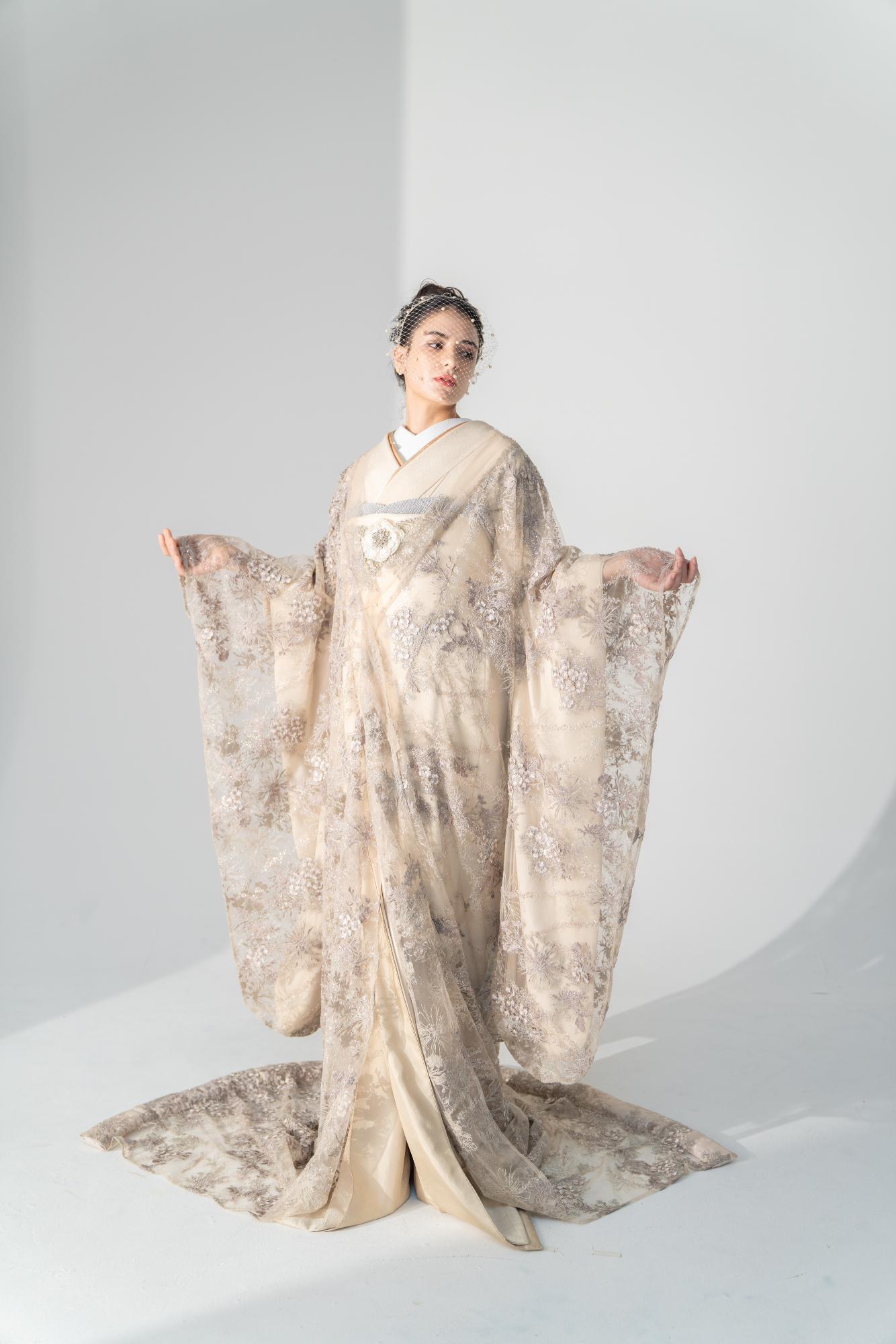 ナチュラルなパターンと幾何学的な曲線の パターンが調和するデザインで、勿忘草を モチーフにした3Dフラワーがポイント。