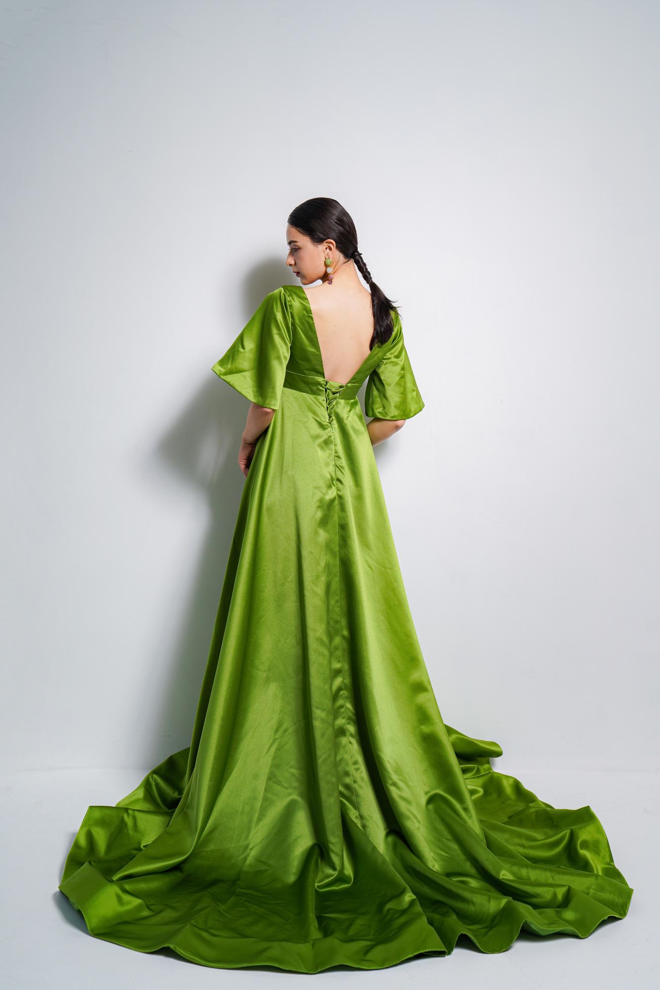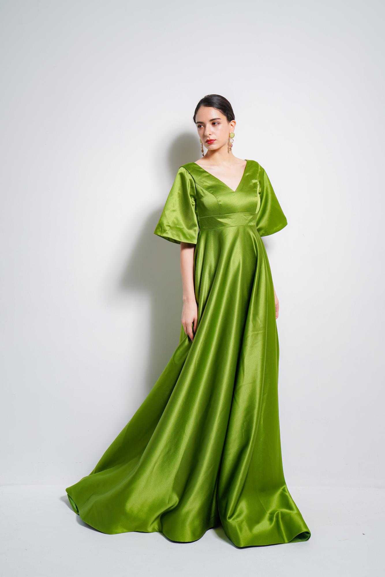 鮮やかなグリーンで明るく華やかさがありつつ、胸元のV字ラインがセクシーさを醸し出します。