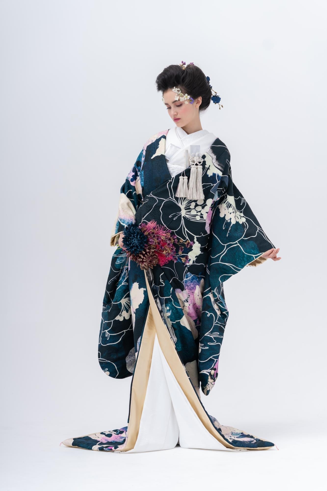 金彩刺繍こだわりの紺地に、ハイビスカスの柄を現代アート風に入れ込んだ、モダンな色打掛。