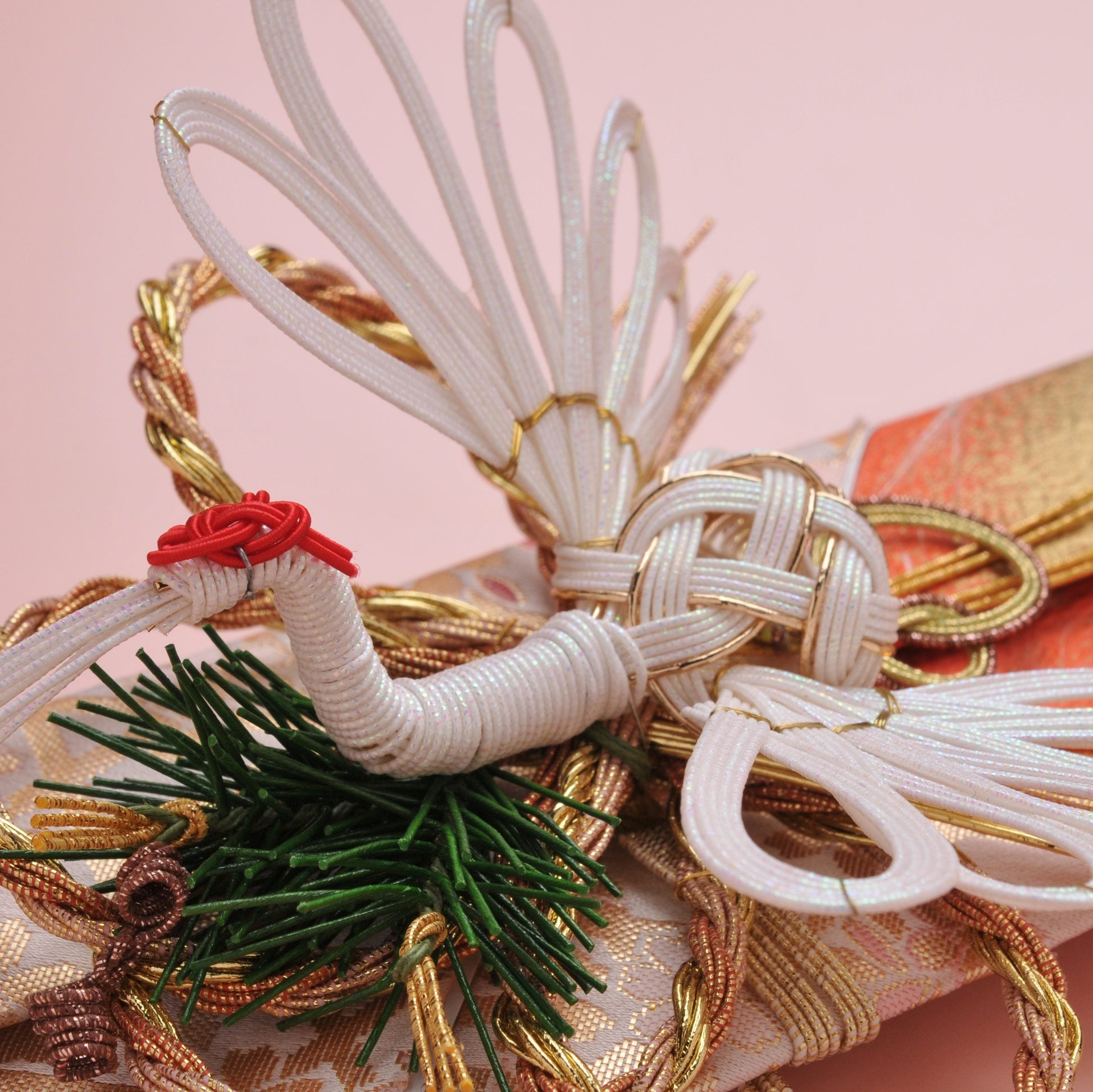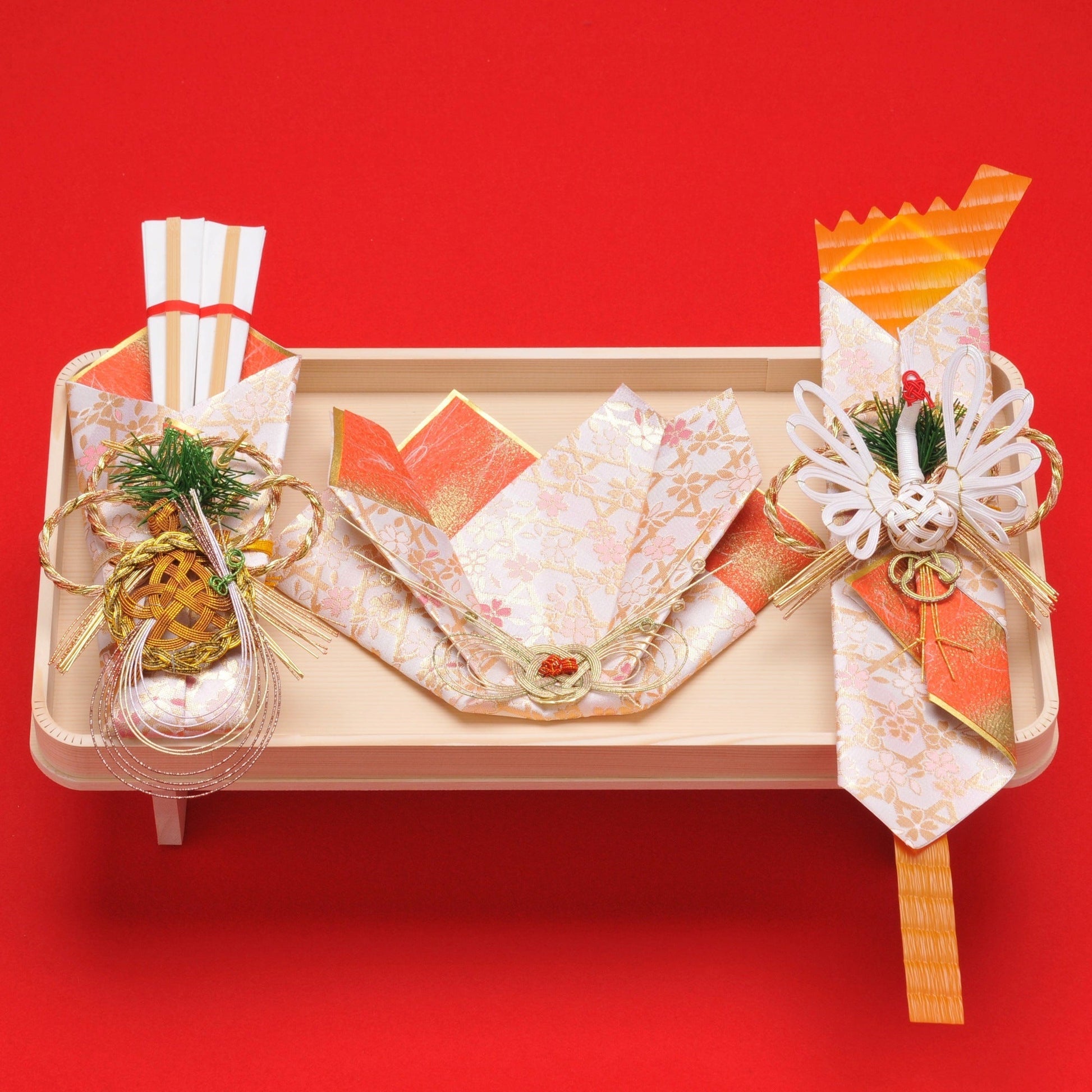 長のし、指輪飾り、末広の三点を白木台に飾ります。