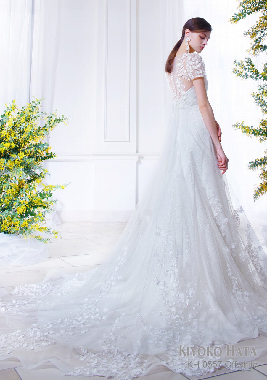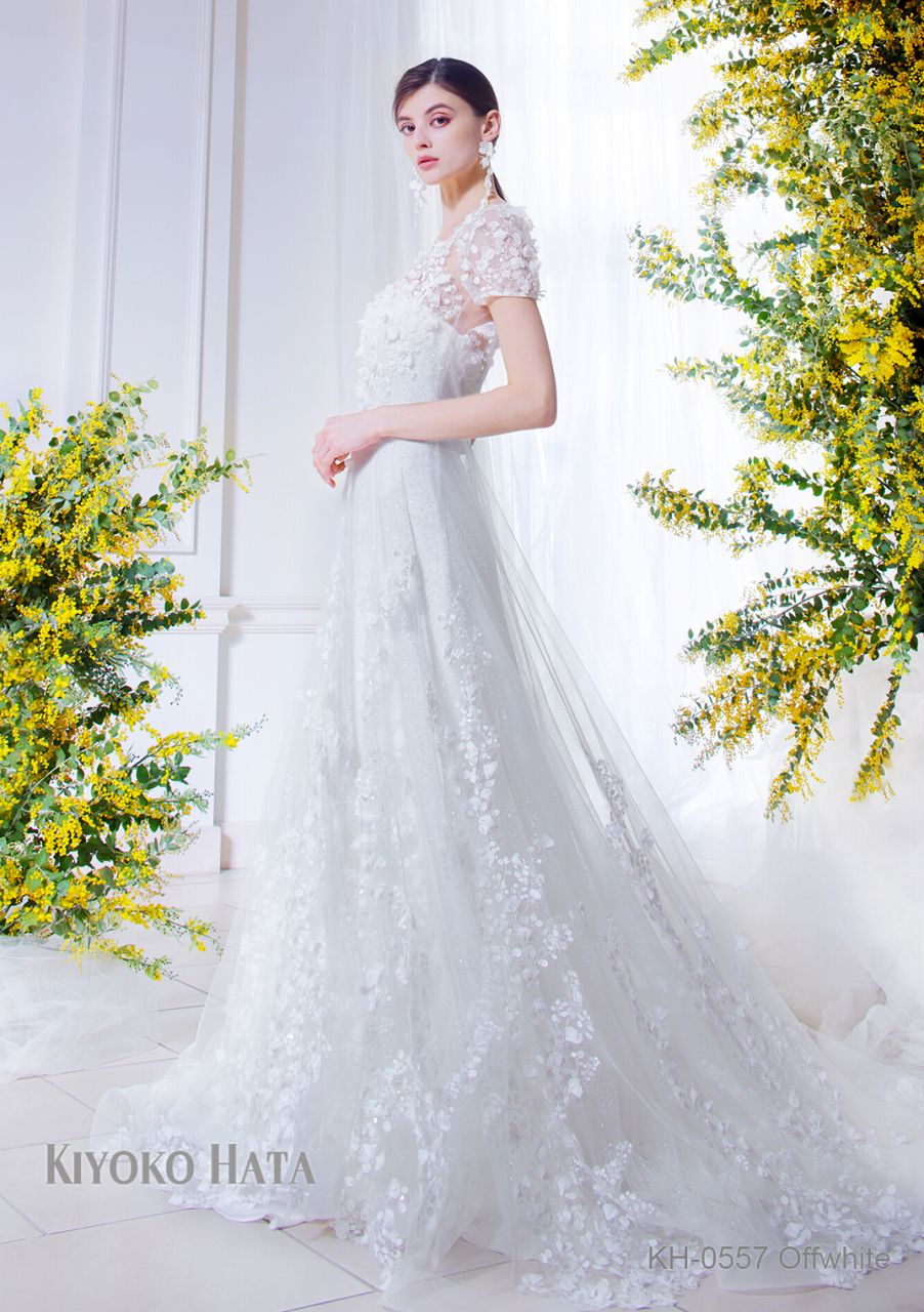小さな3Dフラワーが全身に咲き誇るオーバードレスは繊細な煌めきを放ち