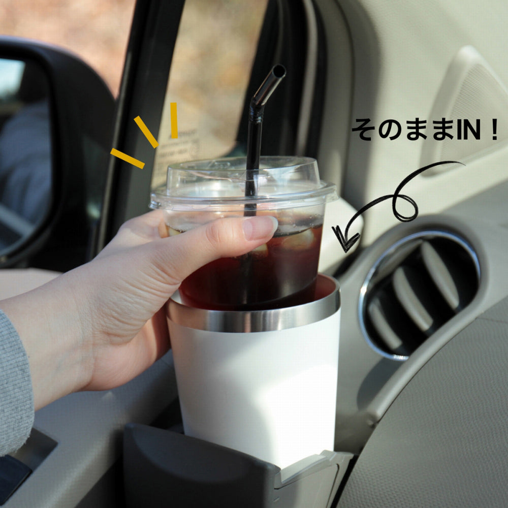 コンビニのコーヒーをカップごと入れておけば美味しい温度が長続き。車のドリンクホルダーにも入り、水滴が垂れないので快適に使えます。