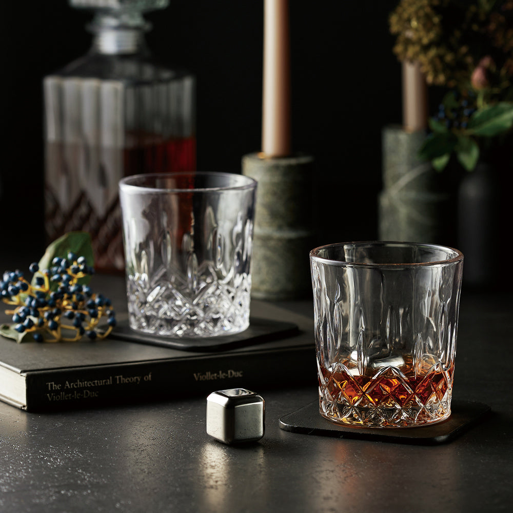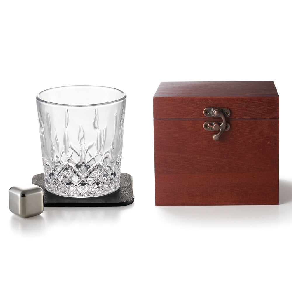 美しい輝きを放つロックグラスと、冷凍庫で冷やして氷の代わりとして使えるフローズンメタルのセット。