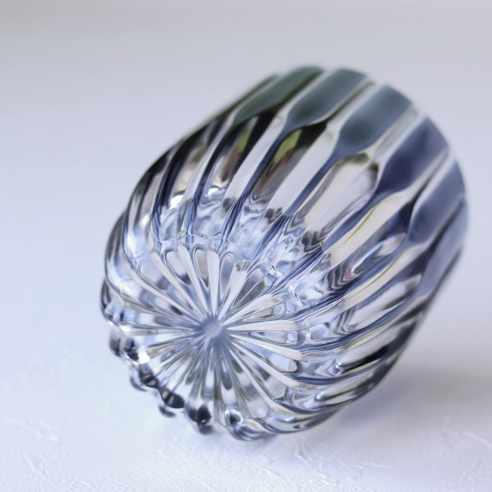太陽から広がる光条のように、底から口元へ広がる美しいカッティングデザインが施されたグラス。