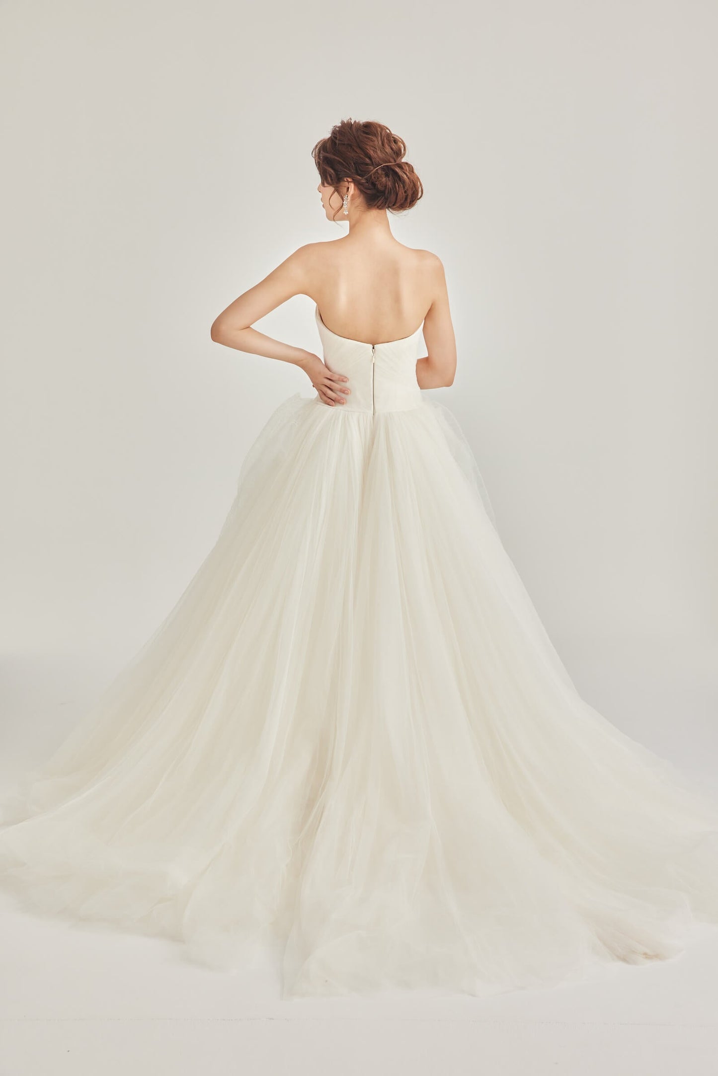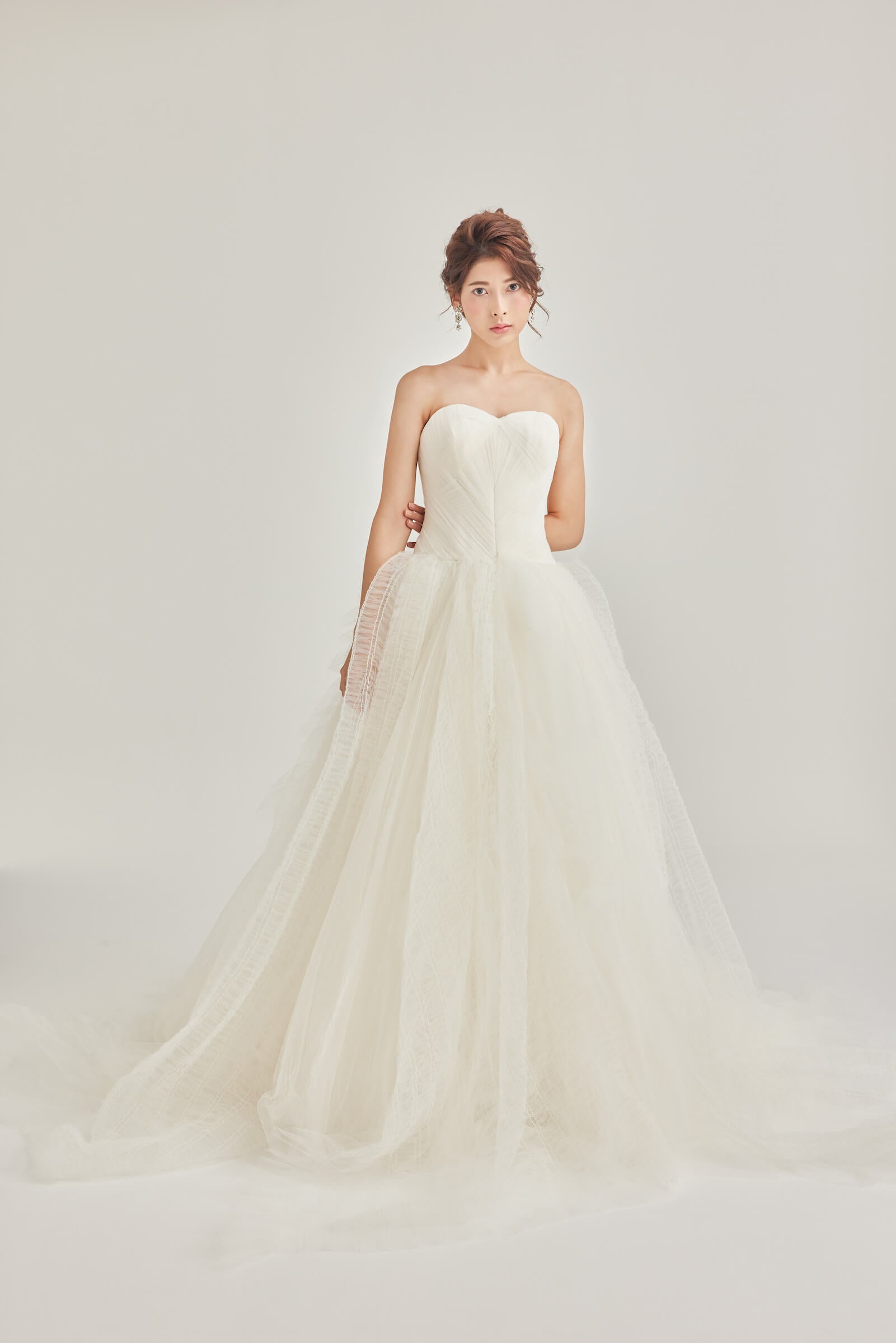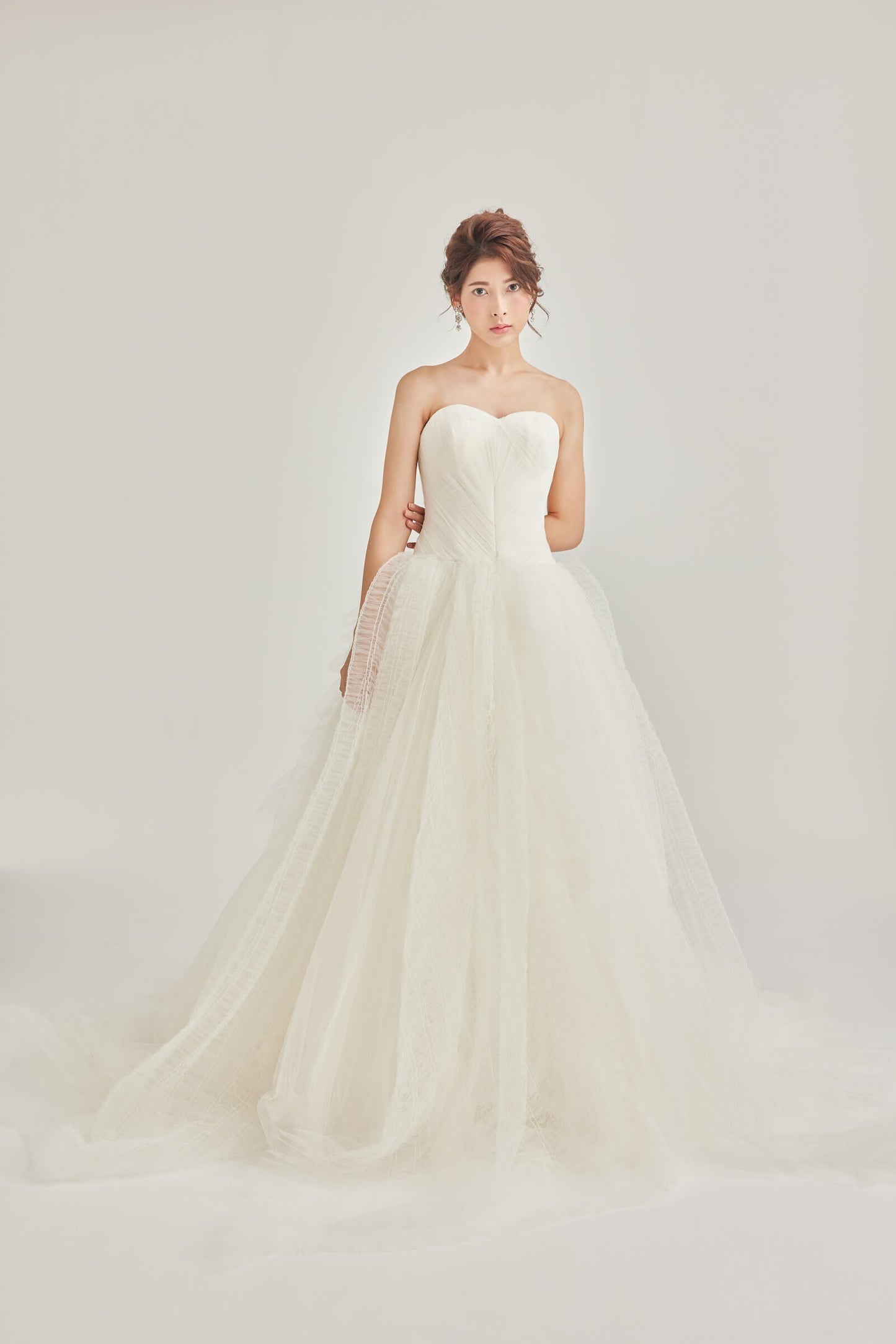 チュールが幾重にも重ねて作られているドラマティックなAラインドレスです。