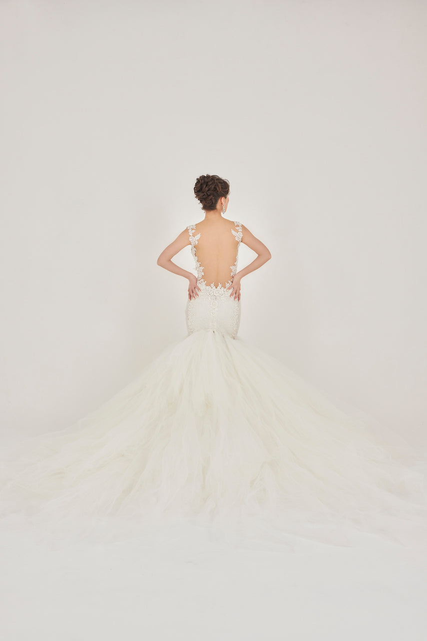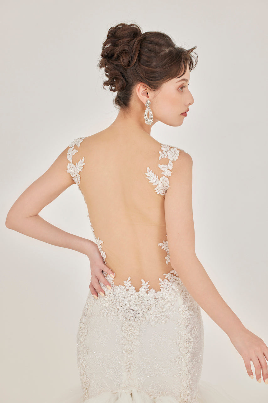 エッジの効いたアシメトリーのボリュームたっぷりなトレーンが目を引きます。