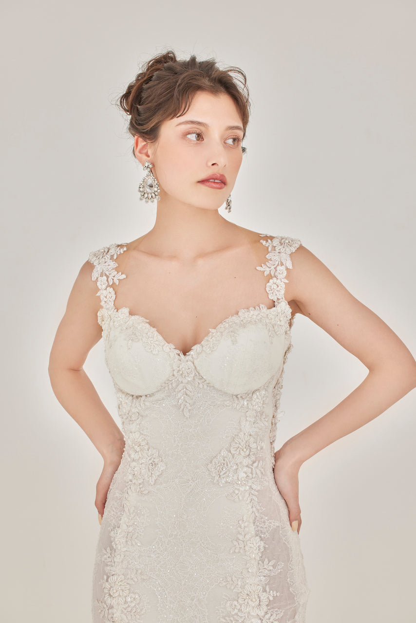 GALIA LAHAV(ガリアラハヴ)のSuzanne(スザンヌ)は、ビーズのフレンチレース、メタリックレースのアップリケが華やかな1着。