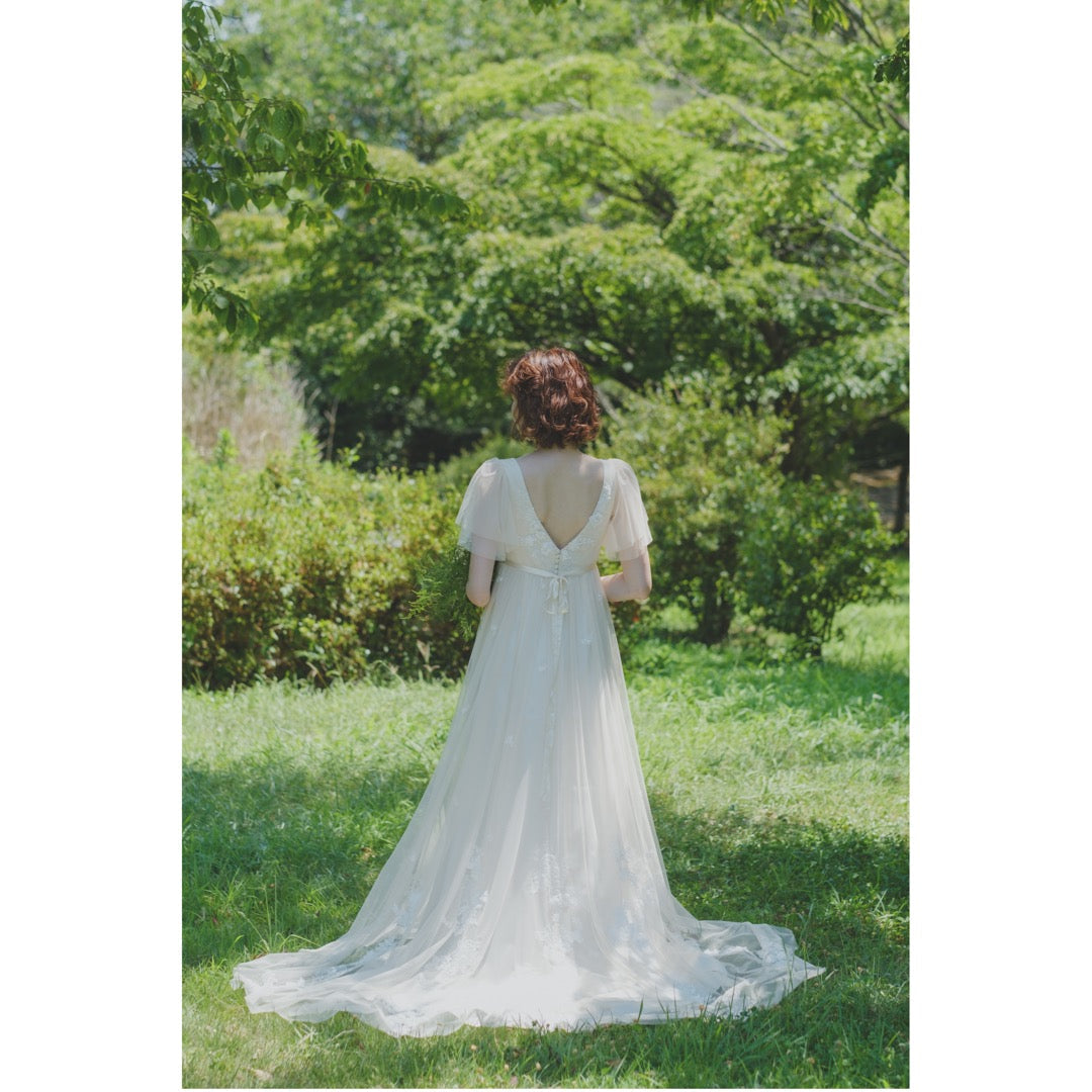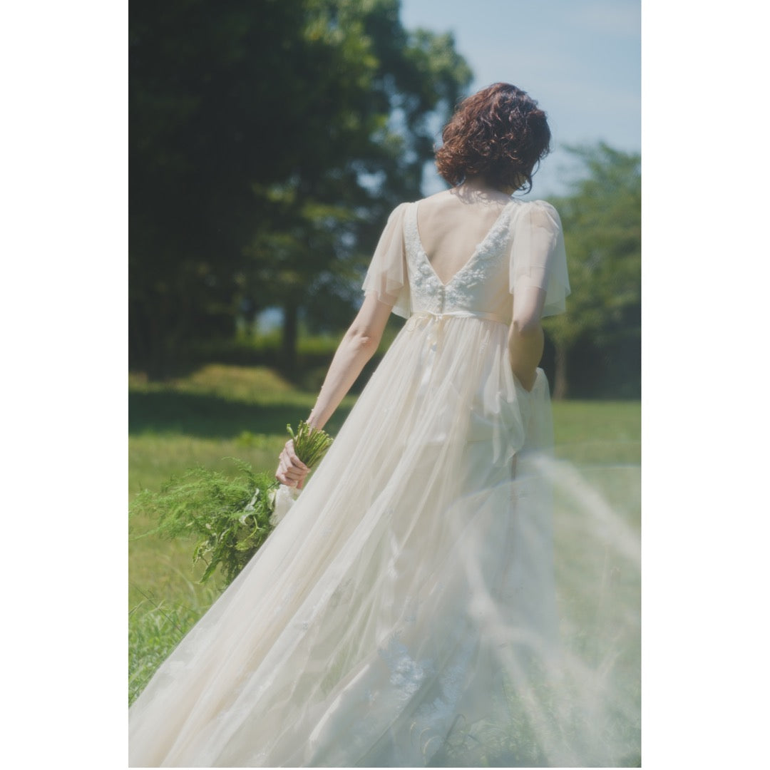 優しいクリームカラーのチュール生地の上に刺繍したのは
