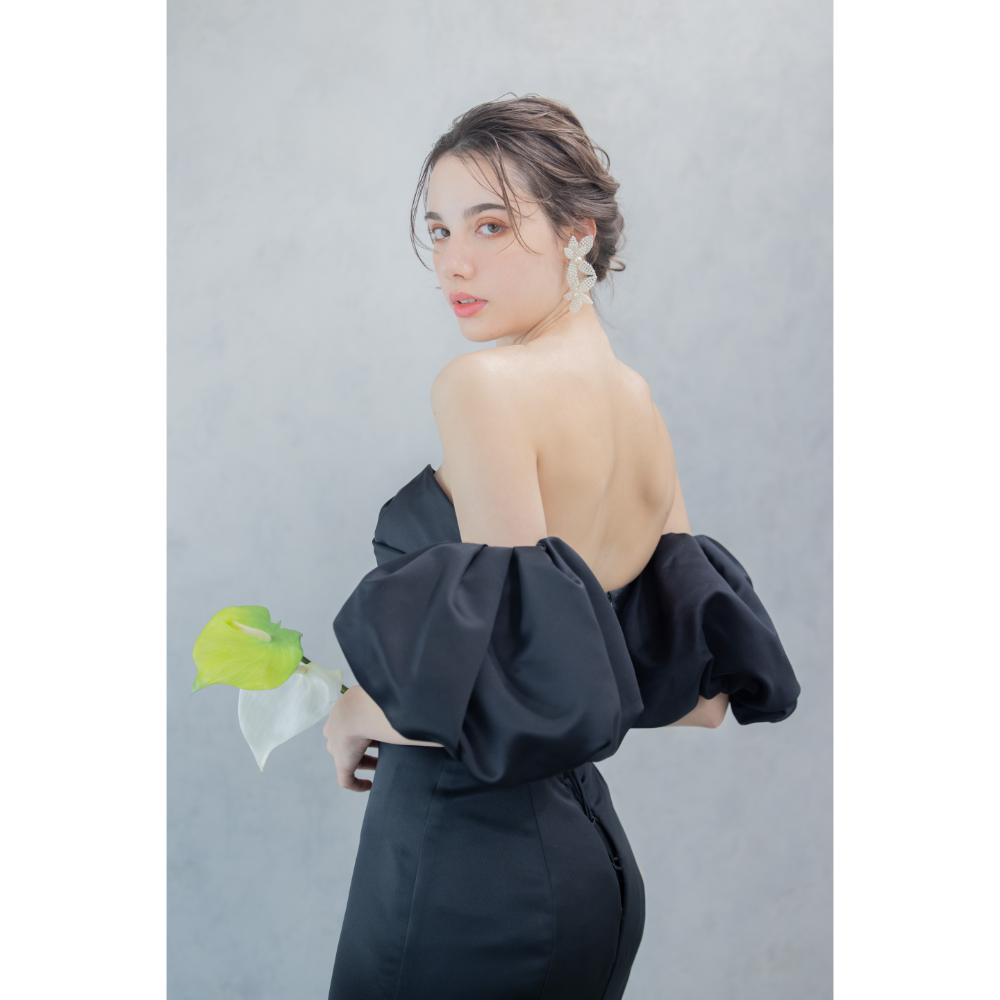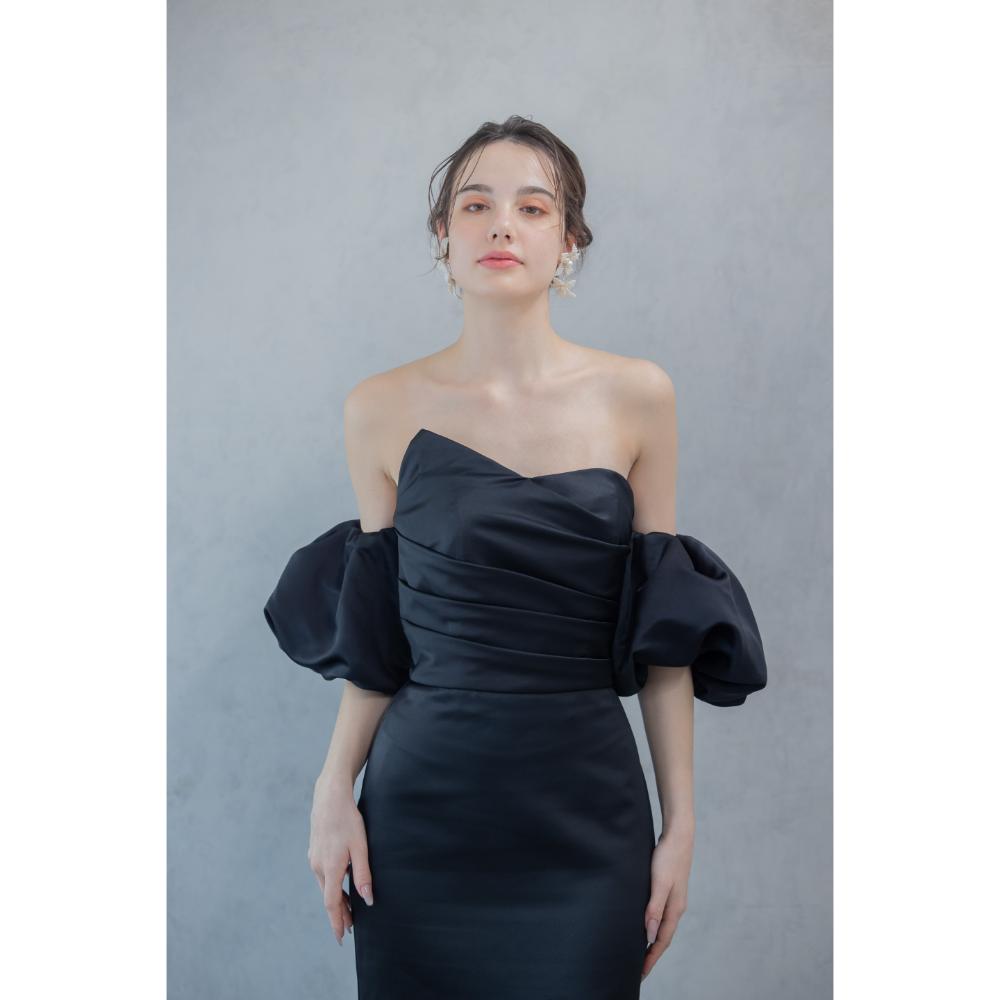 クールで印象的なブラックドレスはパフスリーブを外すとさらに洗練された雰囲気を演出します。