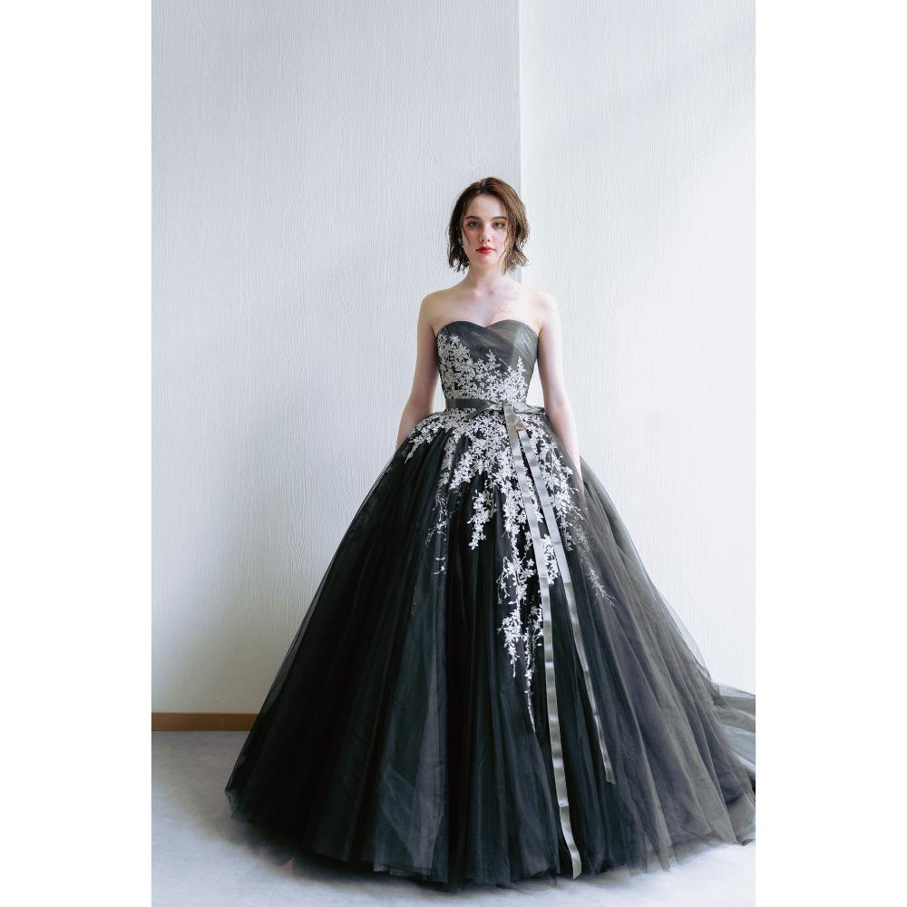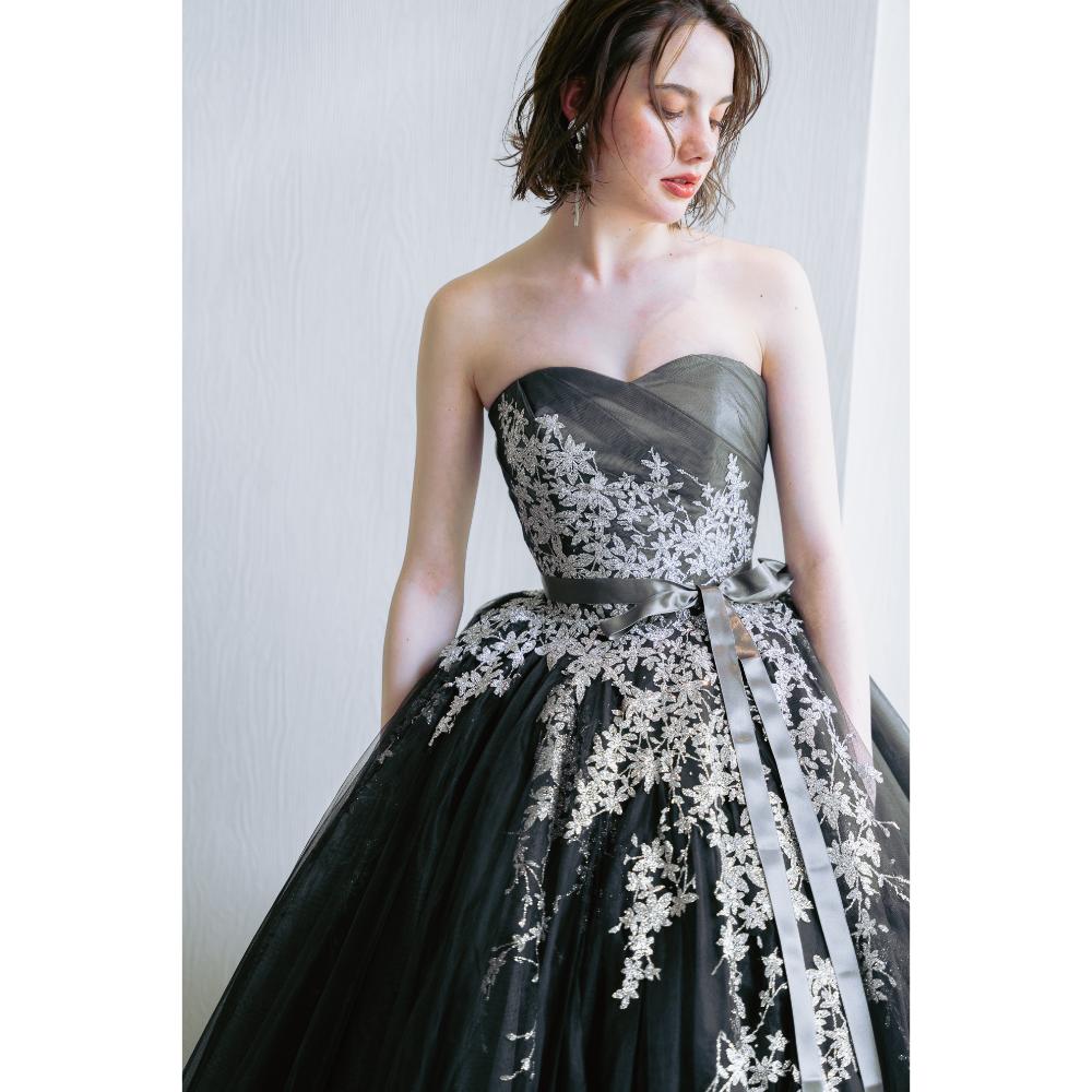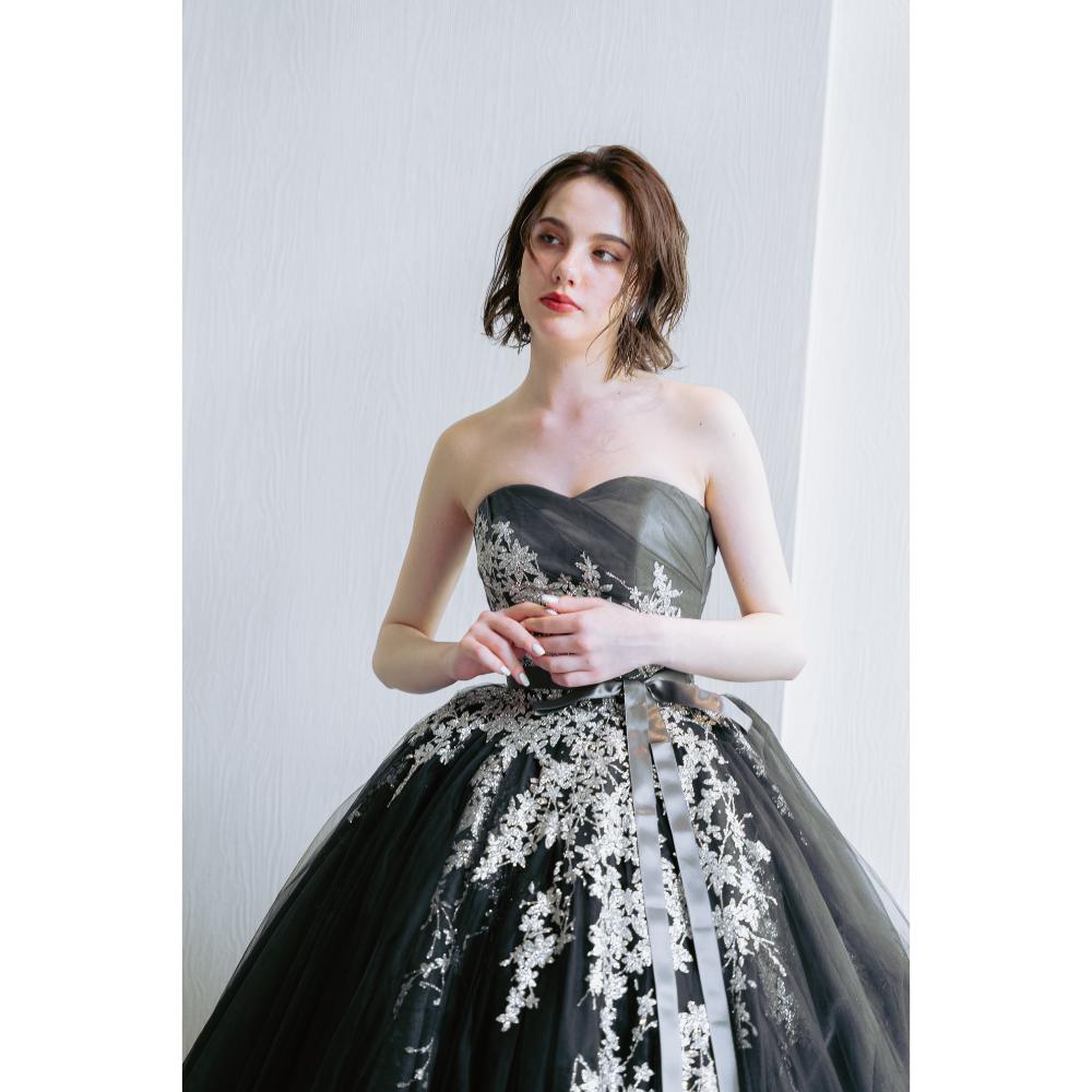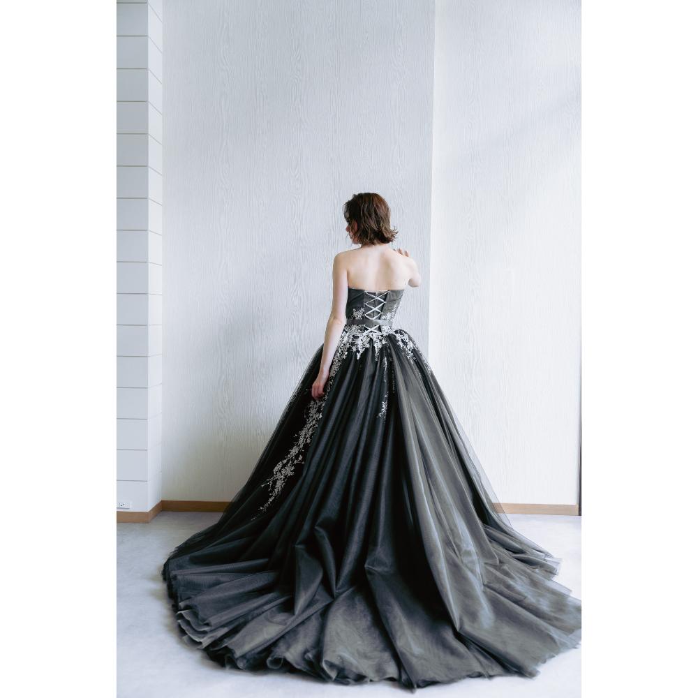 軽やかなオーガンジーで作られたプリンセスラインのブラックドレスは凛としたカッコいいスタイリングをお求めの花嫁様にぴったりの1着