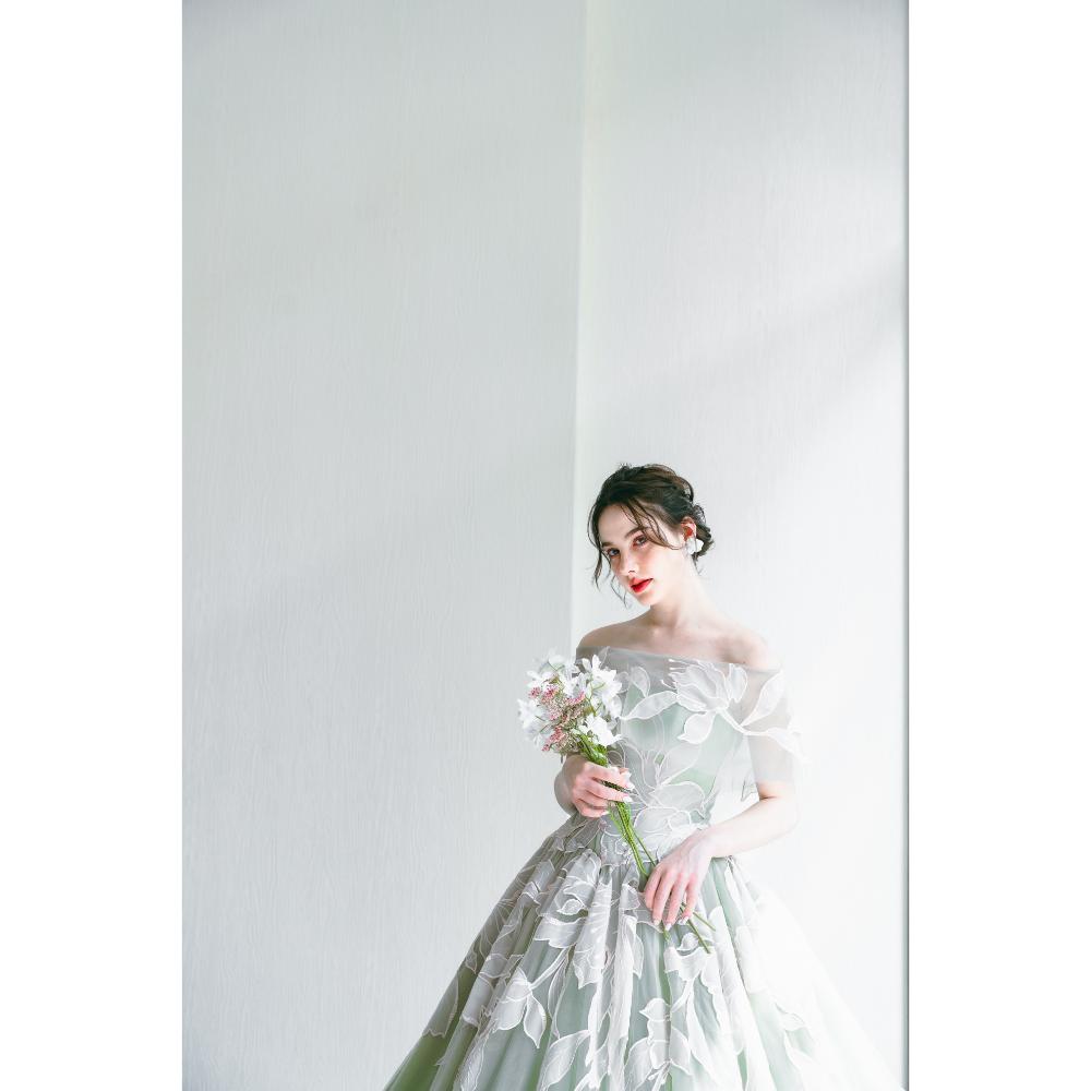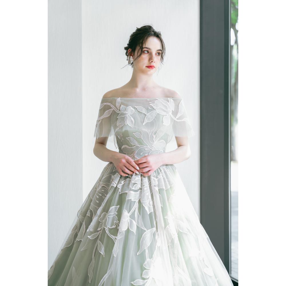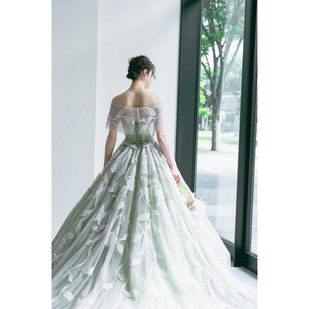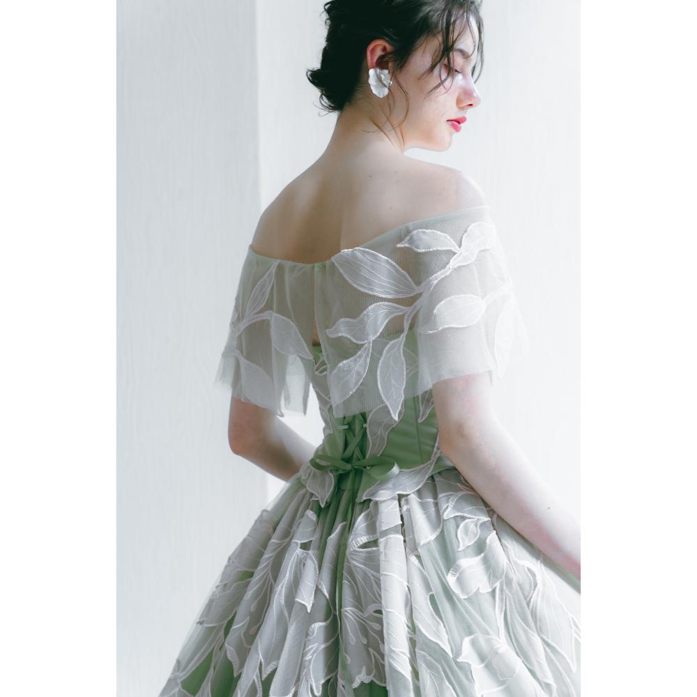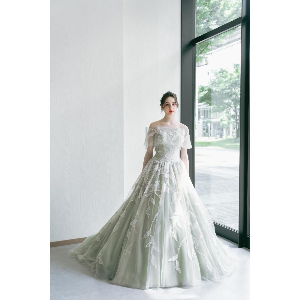 爽やかな印象をあたえるカラーリングに大柄レースを組み合わせお写真映えも抜群の1着です