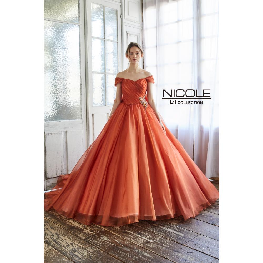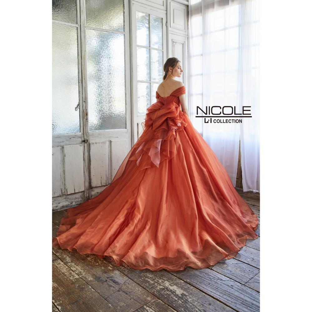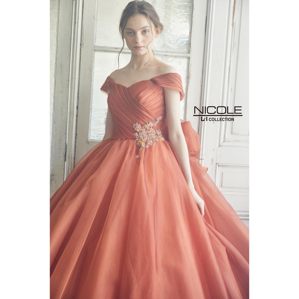 オーガンジー素材でナチュラルな雰囲気のなかにも女性らしさを感じられるテラコッタカラーのドレス