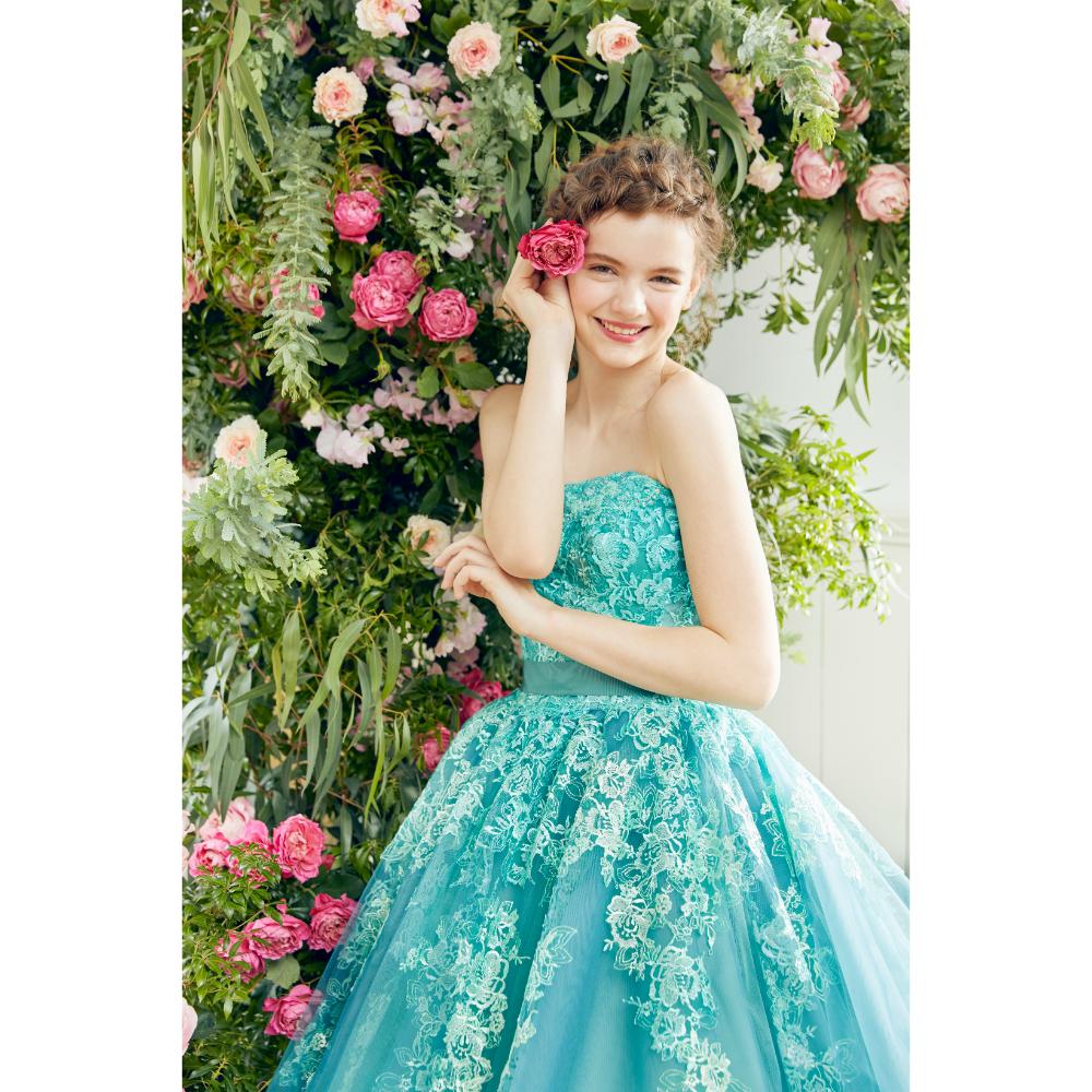 身頃にはレースカラーに合わせ丁寧に手加工で刺繍したビジューが上品に輝き、シンプルなフレアと爽やかなグリーンのグラデーションが可愛らしさと
