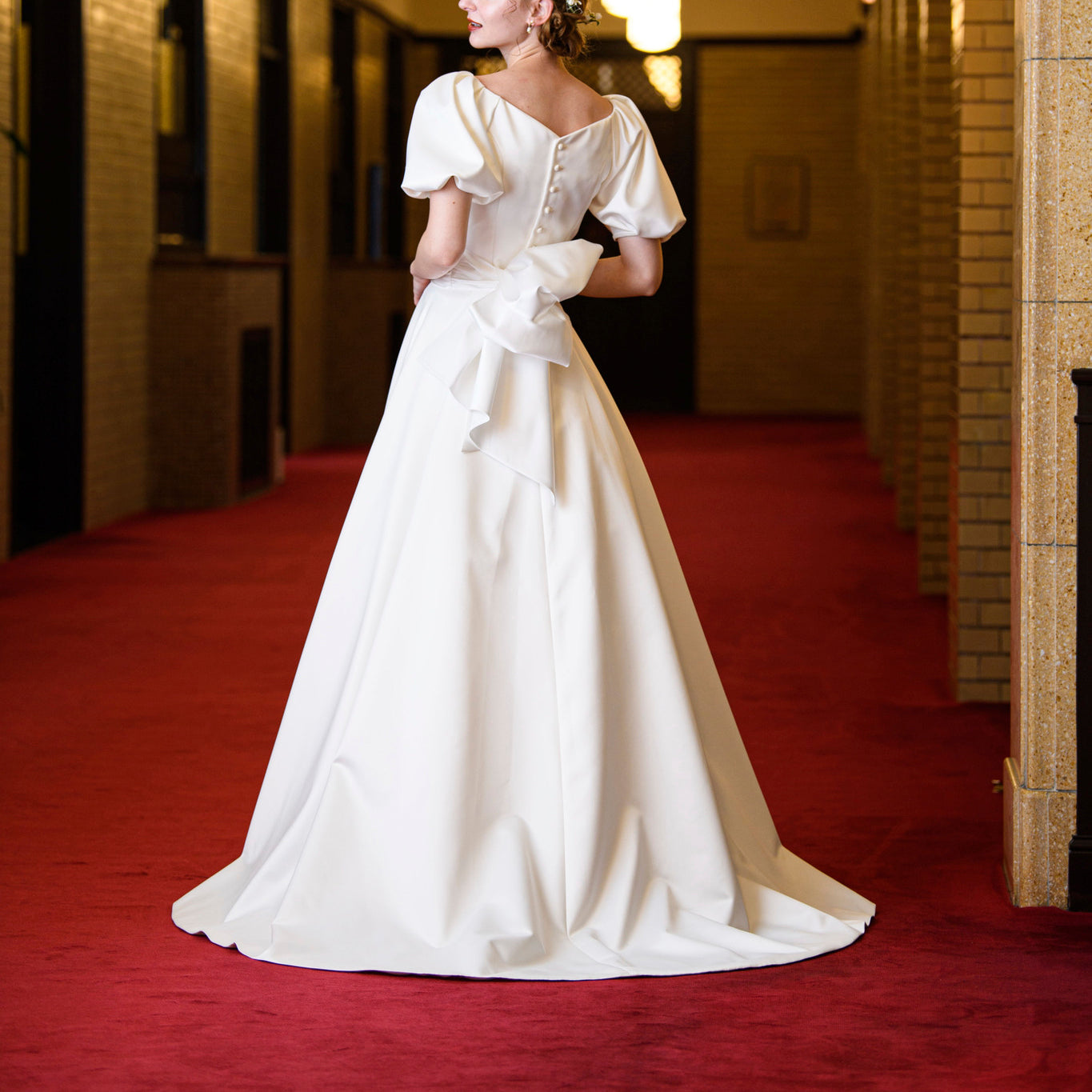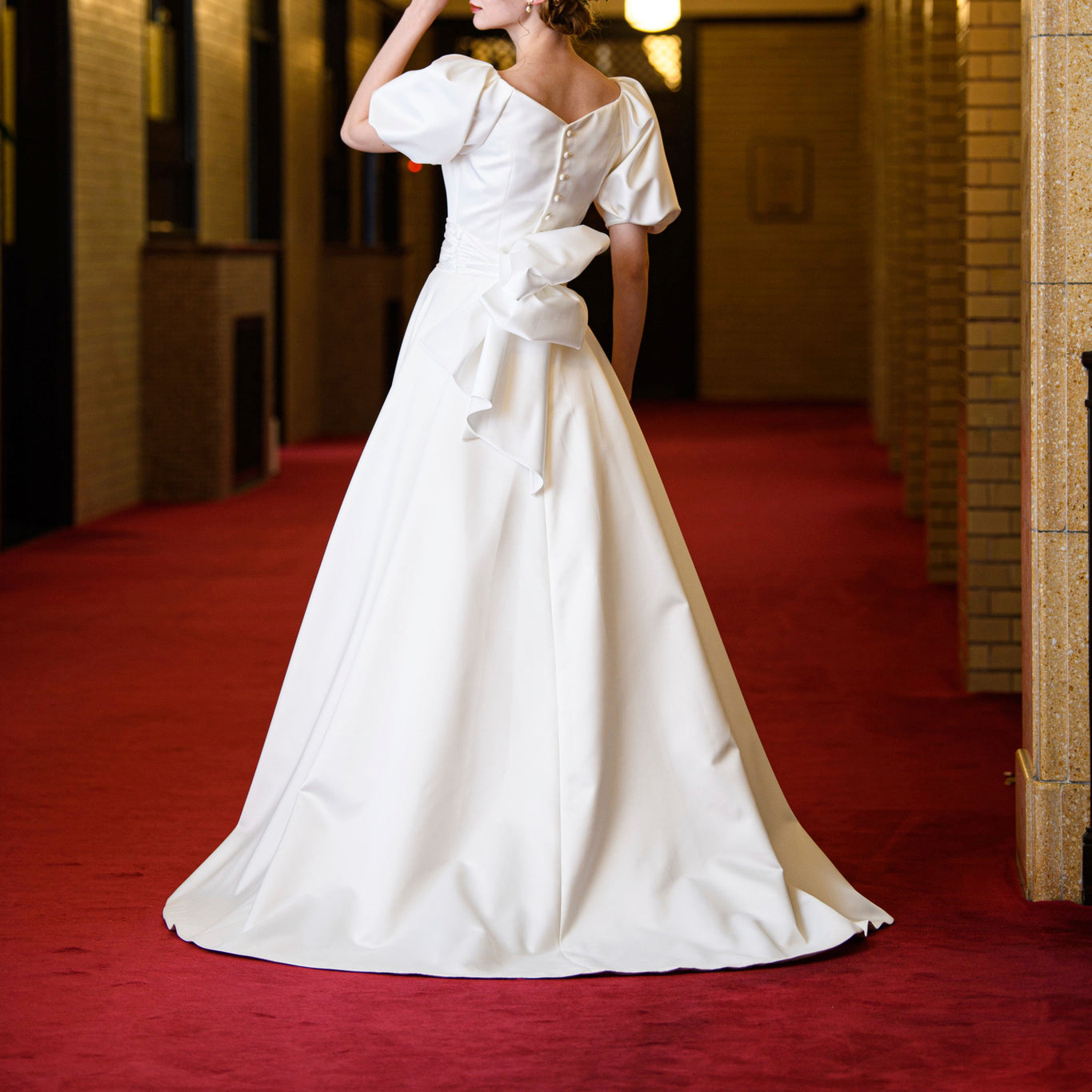 上品なサテンを使い、タックでボリュームを出したパフスリーブや切り替えの少ないエンパイヤタイプのAラインが特徴。