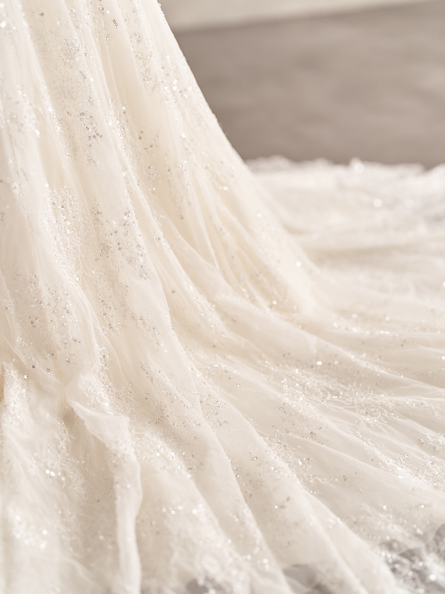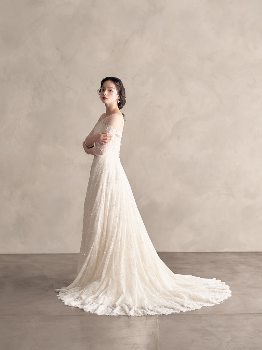 繊細なレースに施されたビーディングが優美に煌めくドレス。