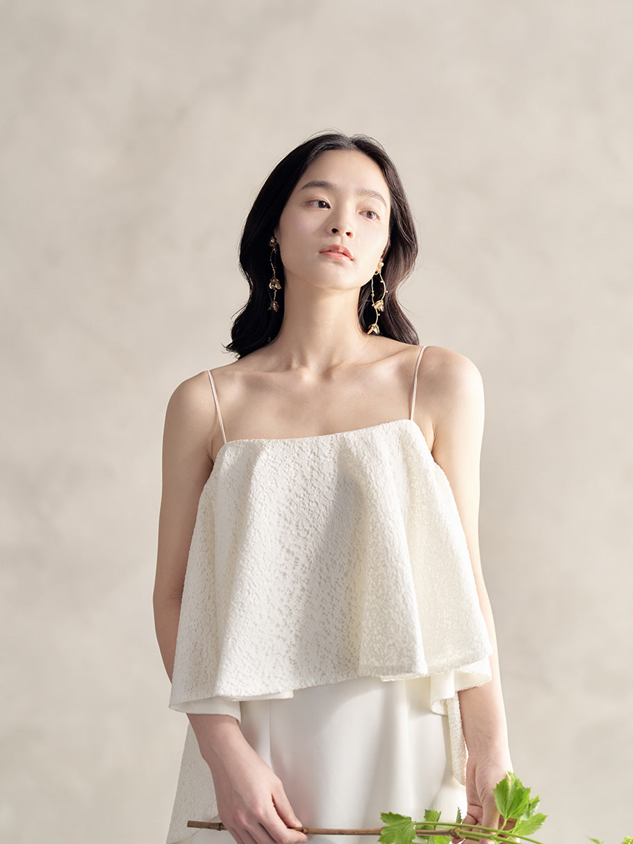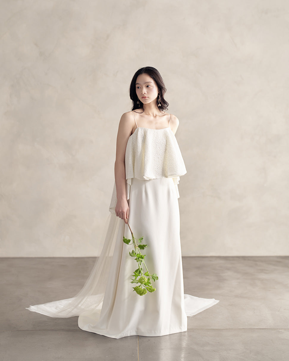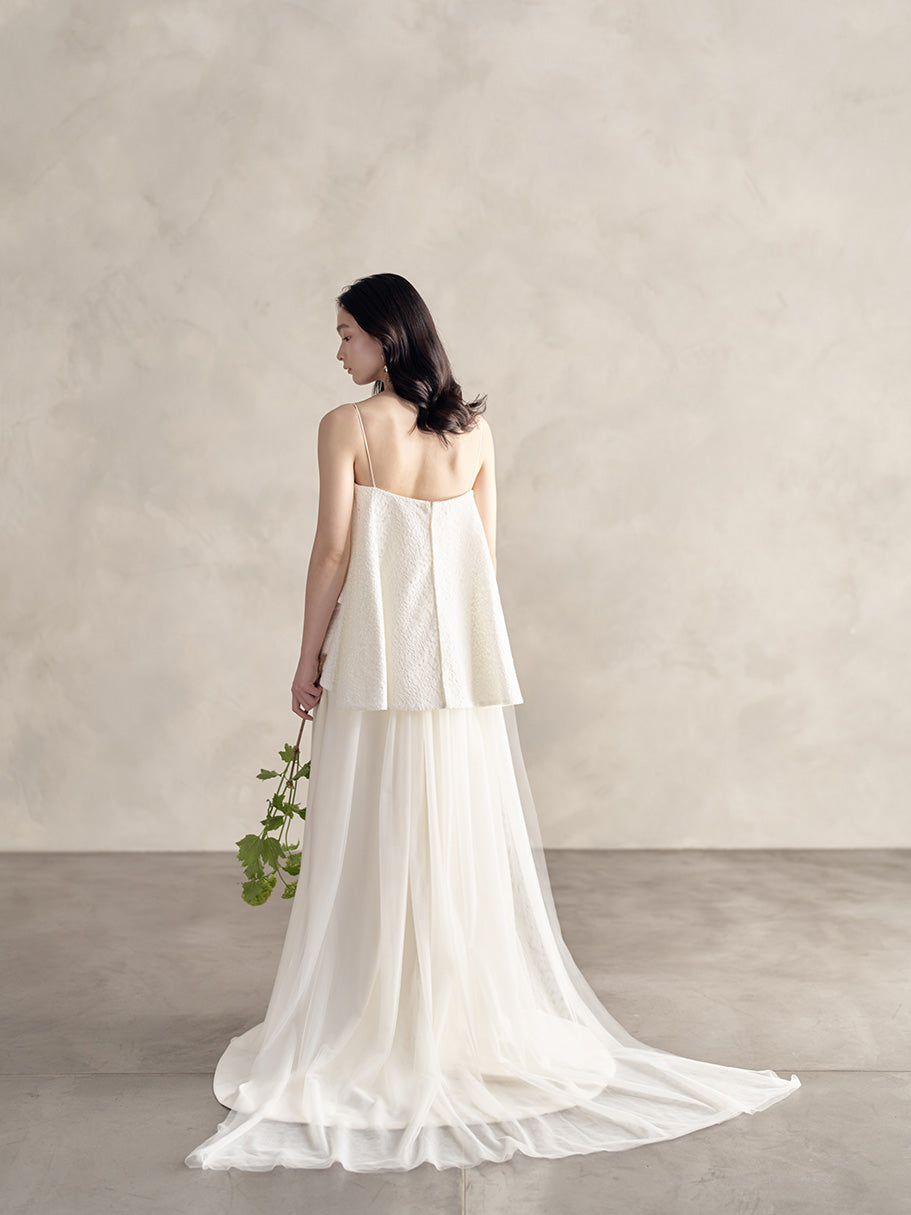 揺れ動くレースのトップス、軽やかなチュールトレーン。