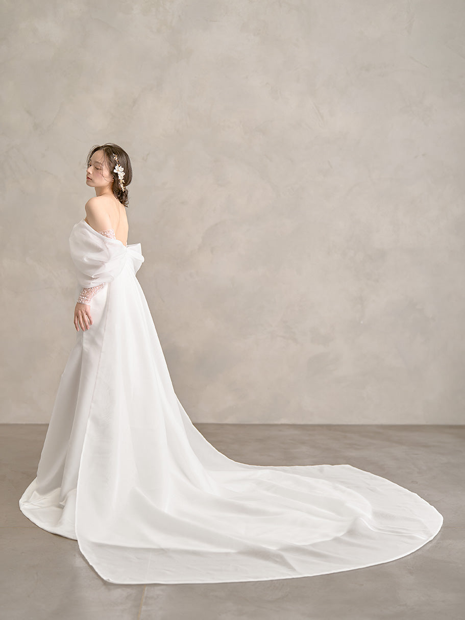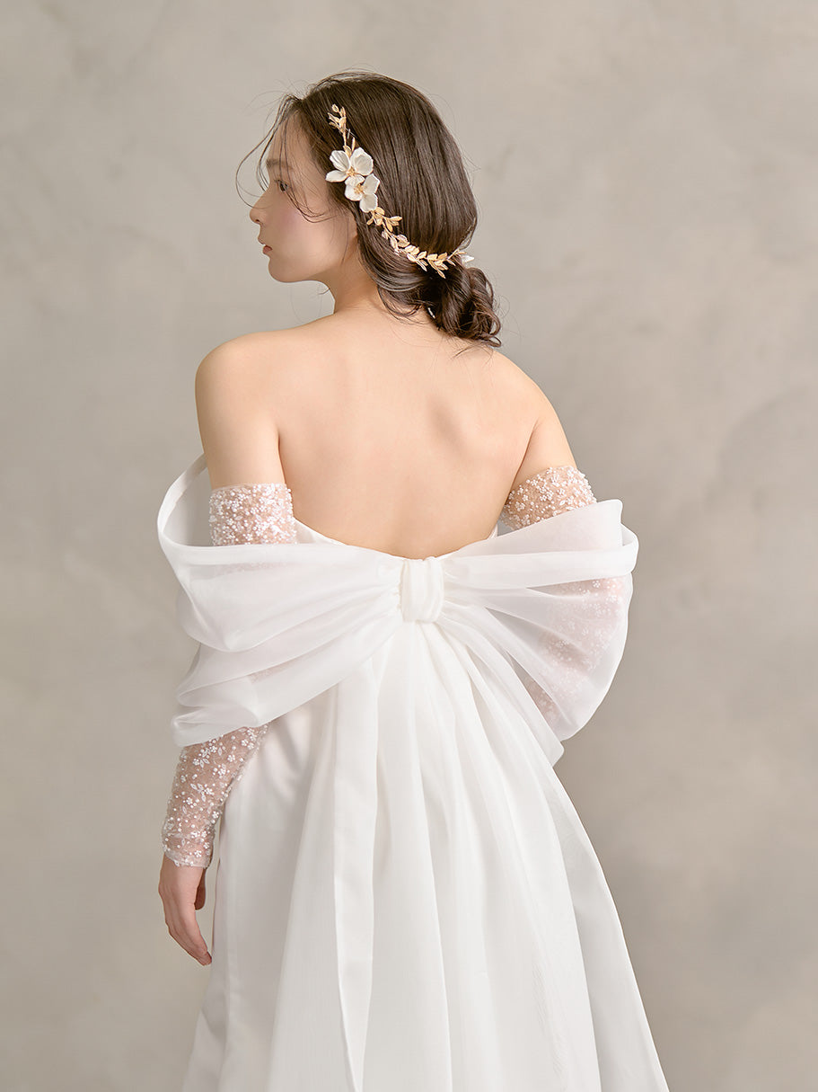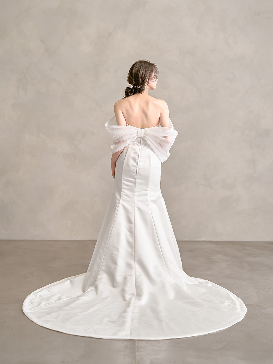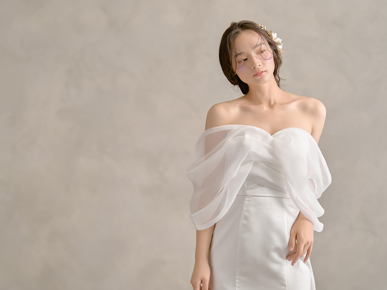 花びらを重ねたようにオーガンジーをまとったドレス。