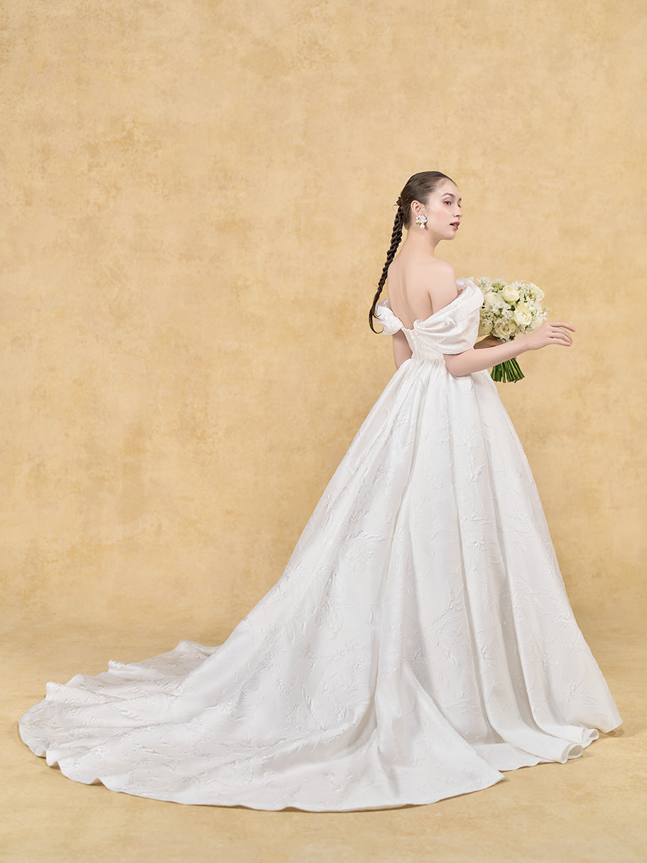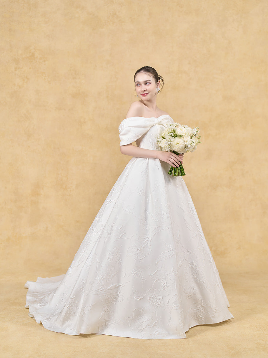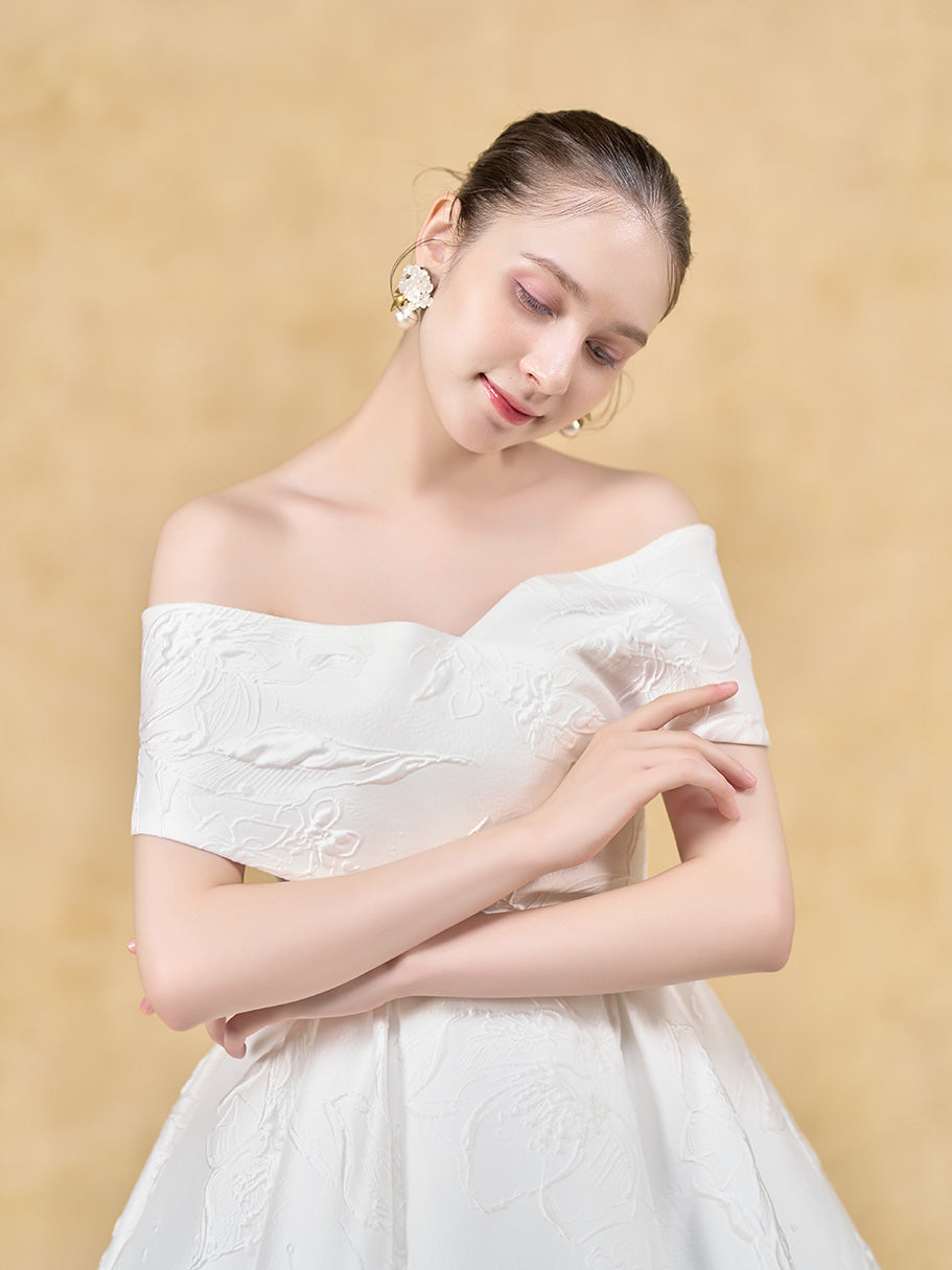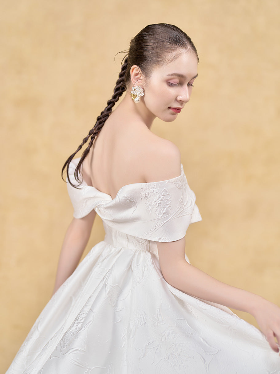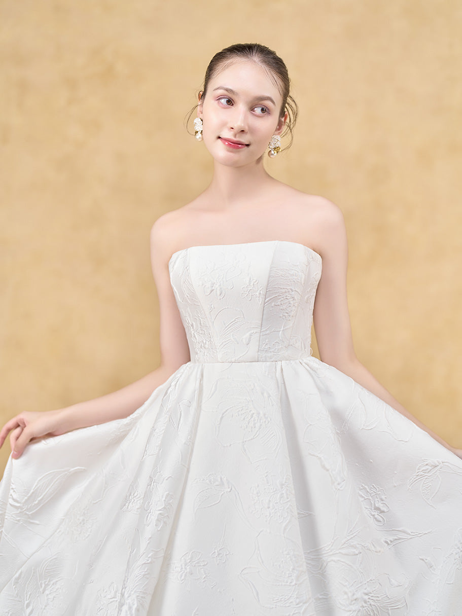 凹凸で図柄を描く膨れジャガードの美しさをシンプルに味わえるドレス。
