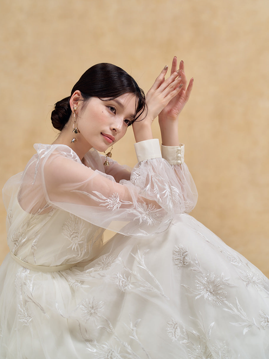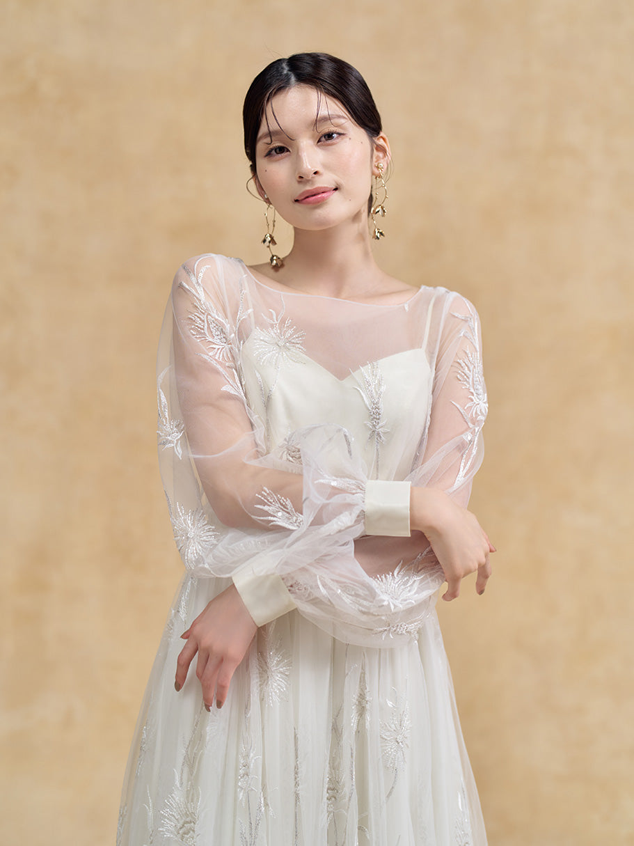 全体にボタニカルモチーフのビーディングをあしらったナチュラルなスレンダードレス。