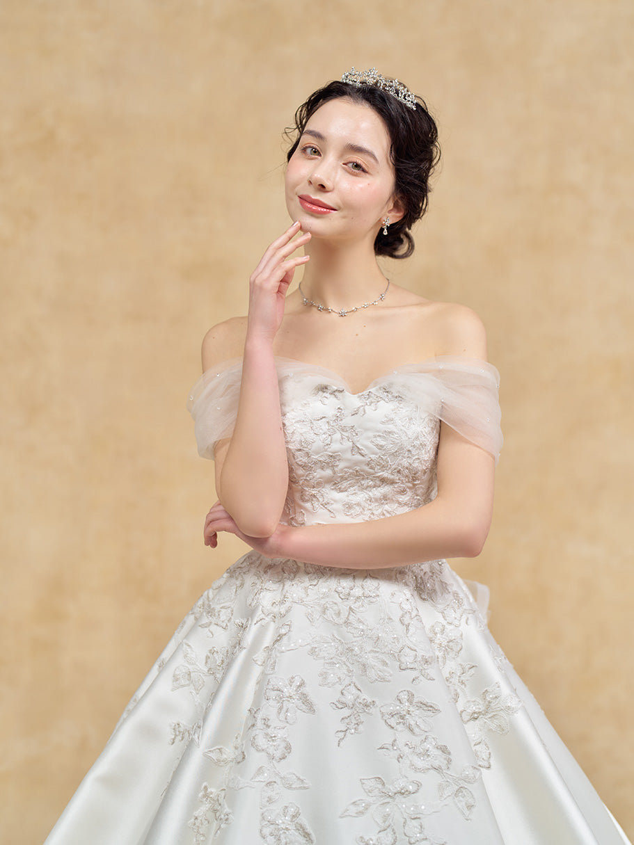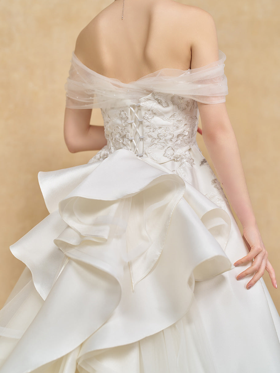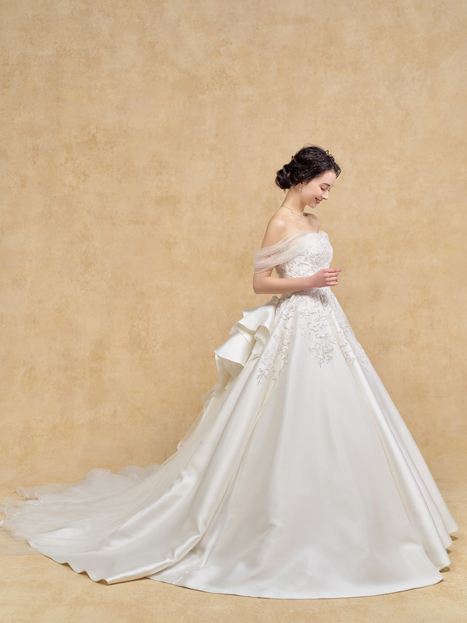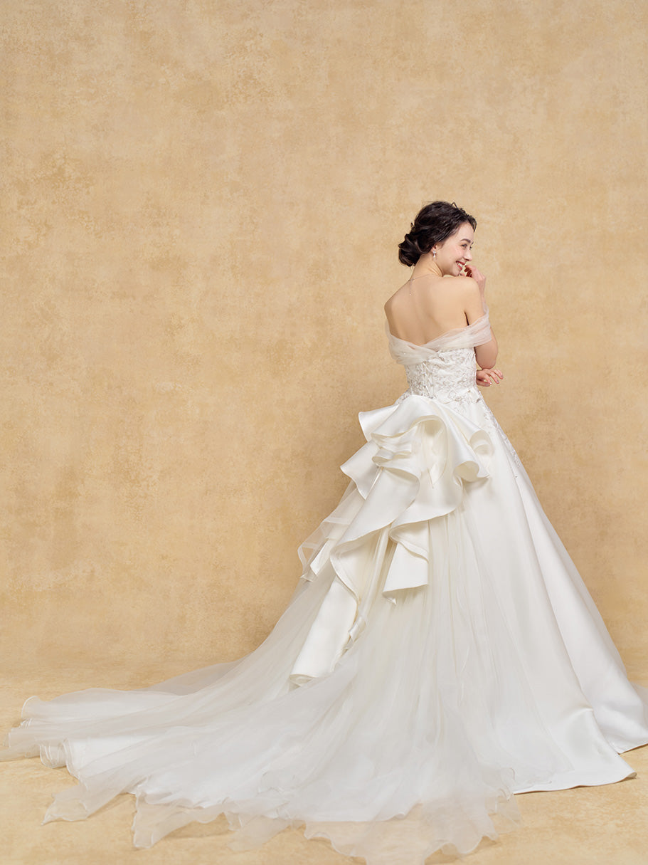 優しく肌を包み込むチュールのオフショルダーとランダムに揺れるオーガンジーのトレーンで、大人可愛いスタイルに。
