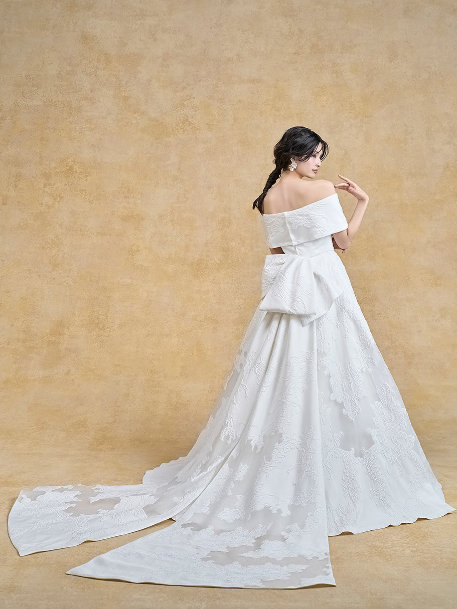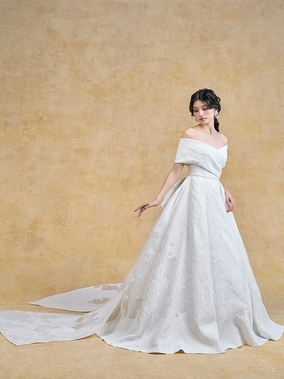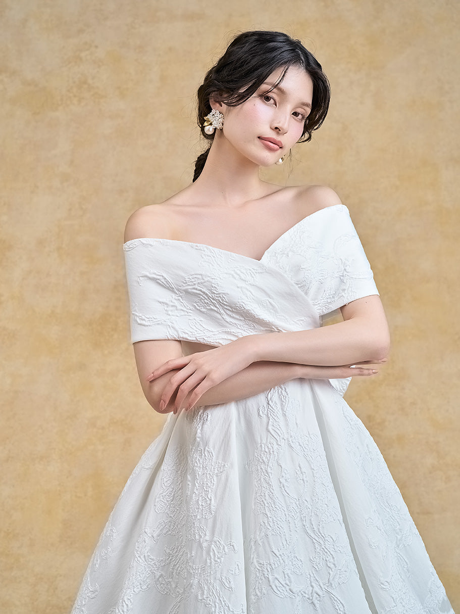ワイドなオフショルダーが気高きプリンセスを彷彿とさせ、品格漂う1着に。