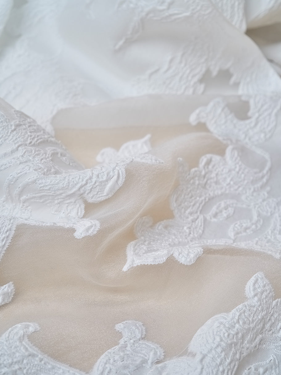 膨れ織の生地がドレス全体に陰影を作り出し、儚げな美しさを感じさせて。