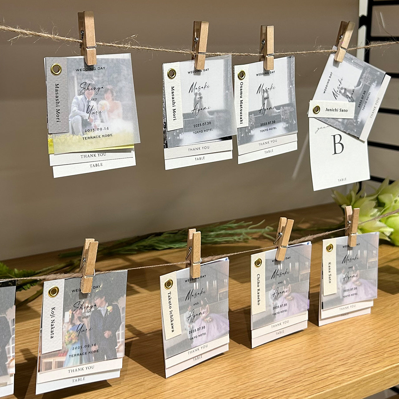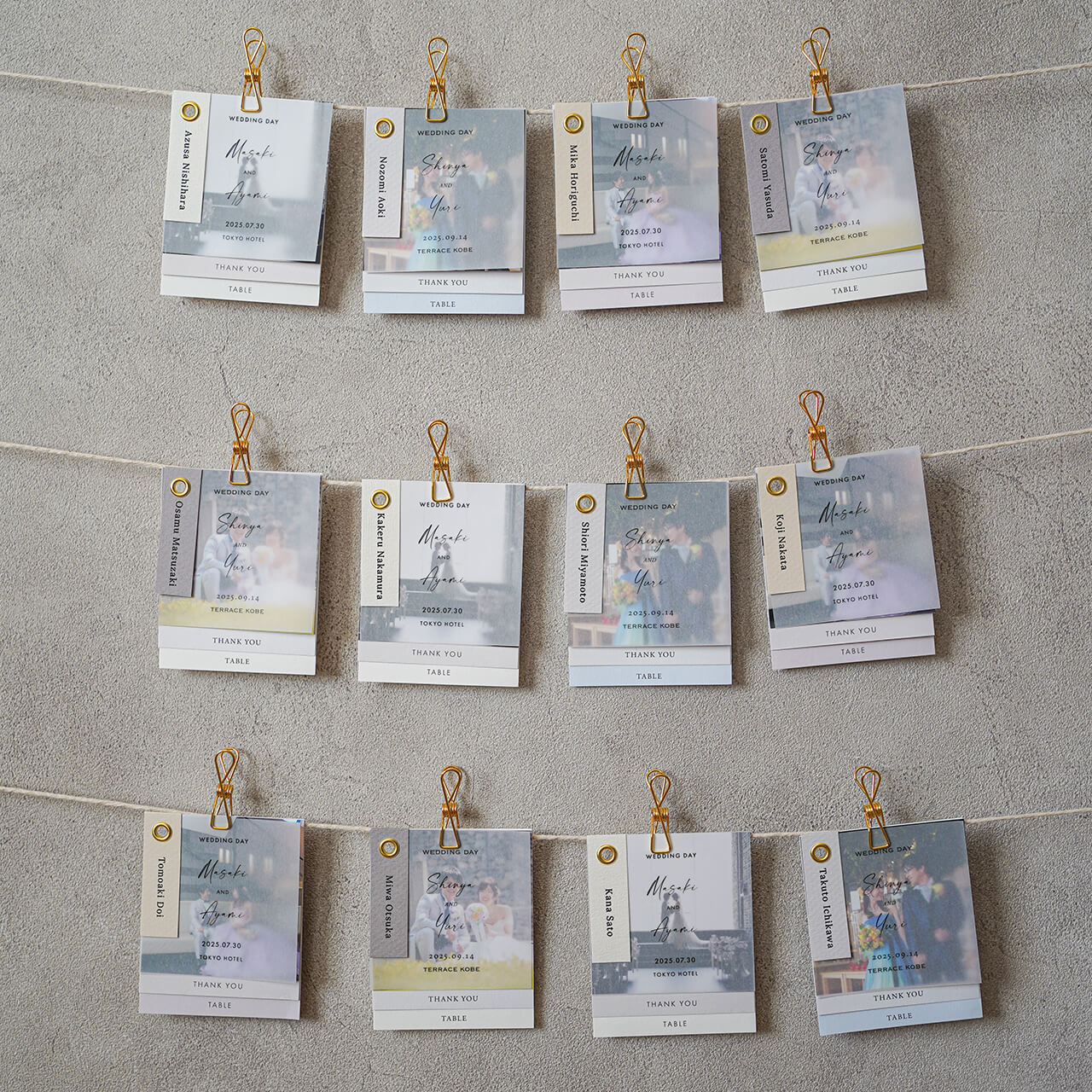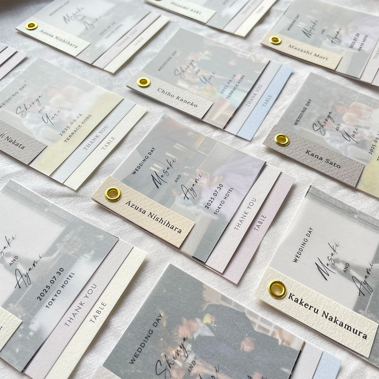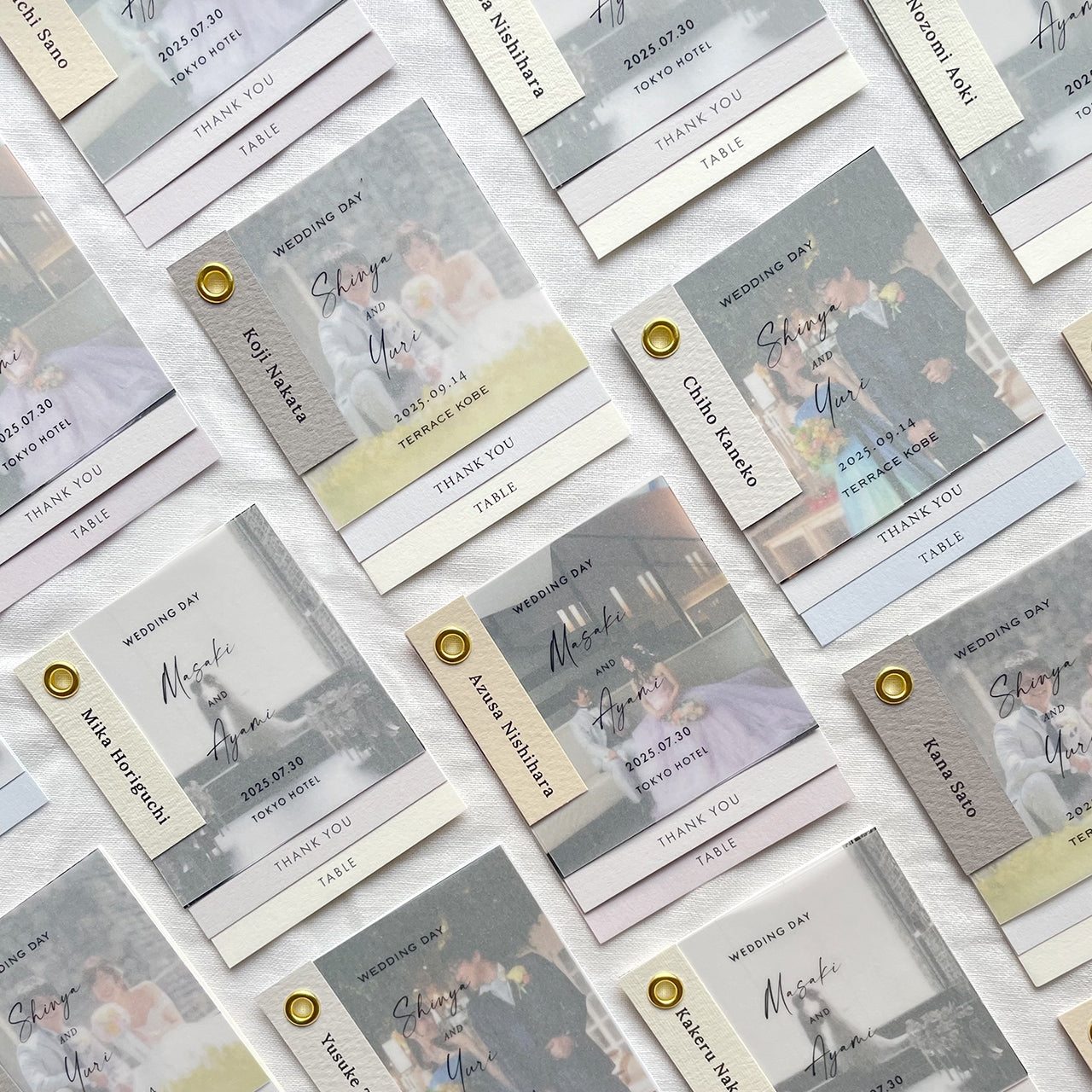 ・席札、トレーシングペーパー、写真、メッセージカード、エスコートカードで1セット