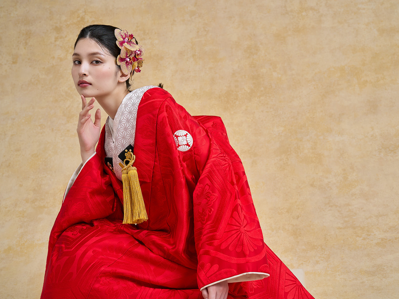 平安時代に公家が礼装に用いた、伝統ある有職文様を纏い婚礼の儀を迎えて。
