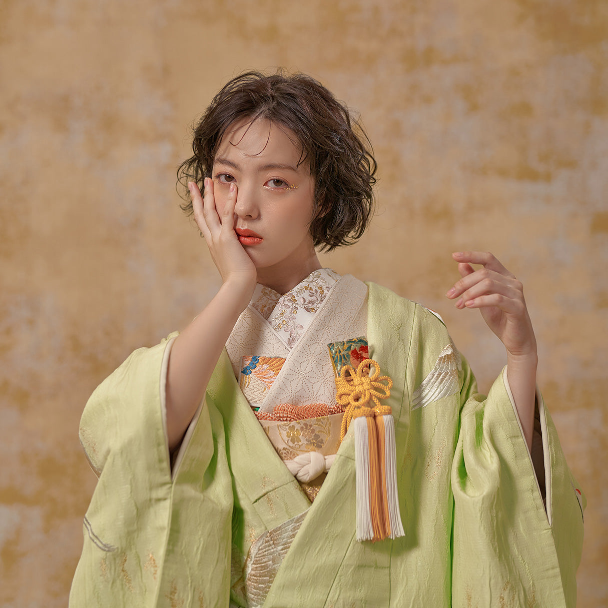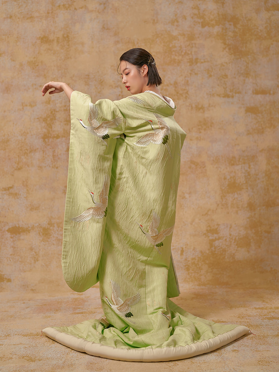 金糸を織り込んだ西陣織特殊織物を「若苗色」に染め上げ瑞々しさを表現しました。