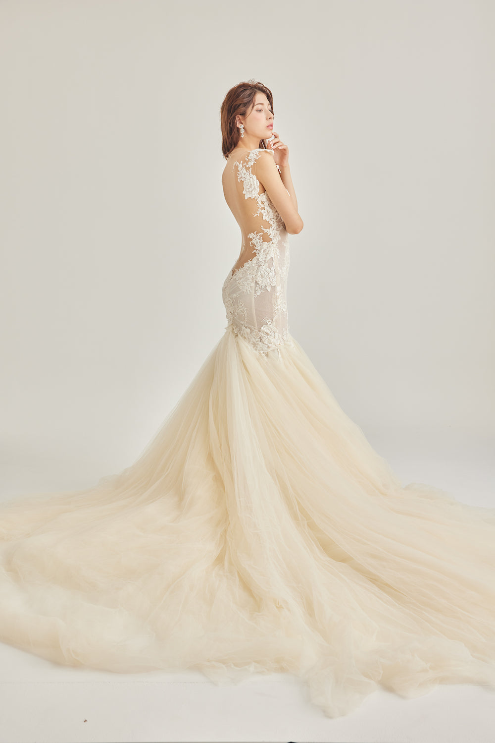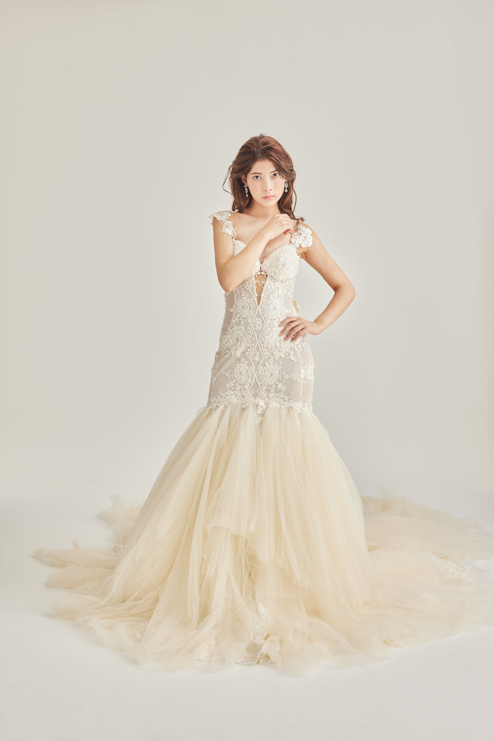 Rihanna(リアーナ)は、シルクチュールの刺繍やシャンティリーレースをふんだんに使い、人魚のようなドラマティックさをイメージしたマーメイドラインのウエディングドレスです。