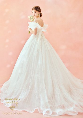 天使の羽をイメージした、ひらひらオーガンジーのオフショルダーのドレス。