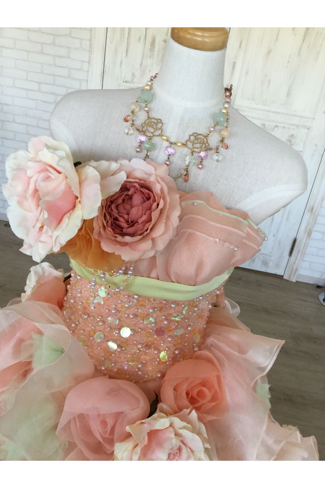 お花の間から覗かせるオーガンジーのフリルはドレス全体を軽やかな印象に見せてくれます。