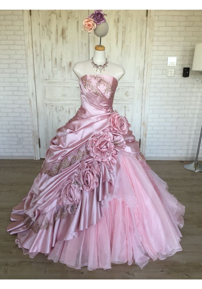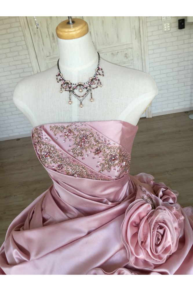 光沢あるサテン生地に、ゴージャスなグリッターを胸元に散りばめた上品で大人可愛い色ドレスです。