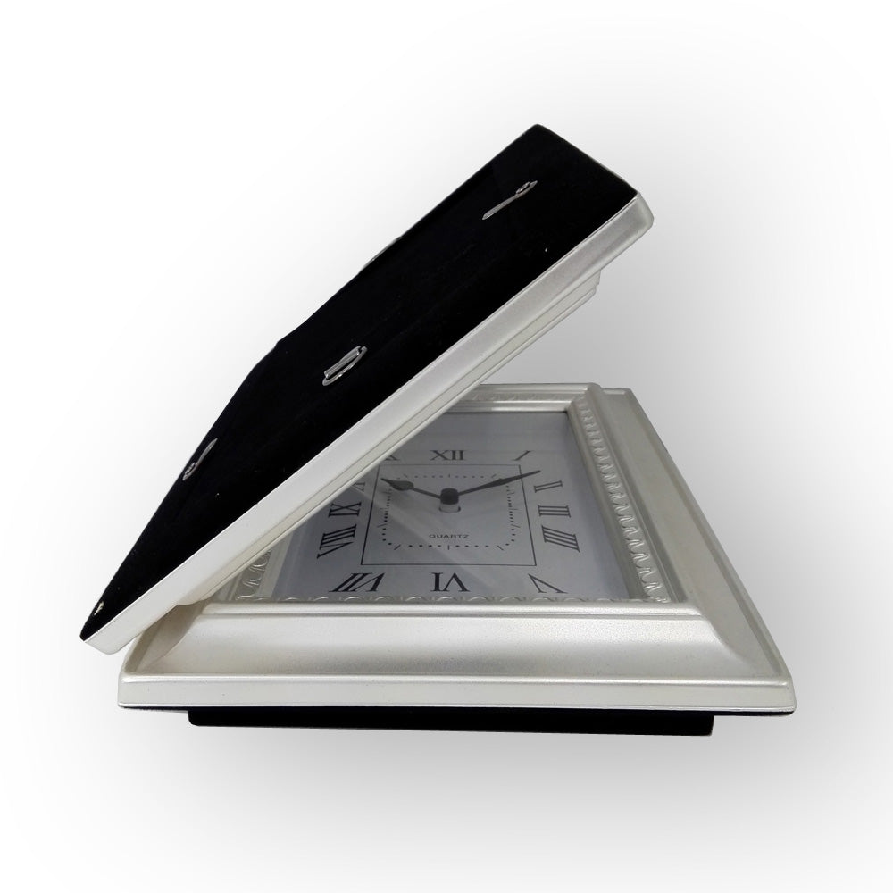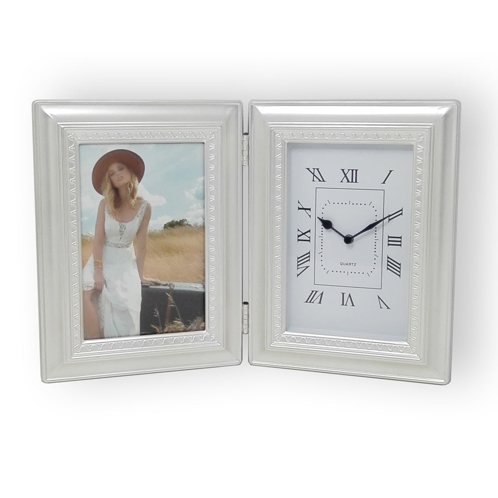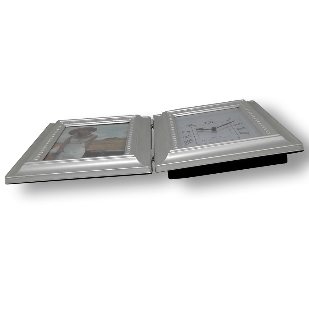 美しく仕上げられたシルバーフレームに写真立てと時計が付いたフォトフレームです。(時計用の電池は別売です。)