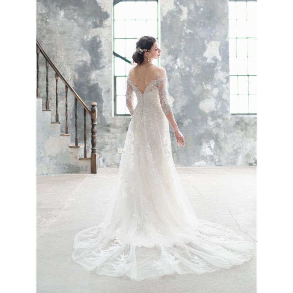 チュールで覆われるデコルテや、深いお背中、スリーブのイリュージョンレースがとっても美しい花嫁様を演出。
