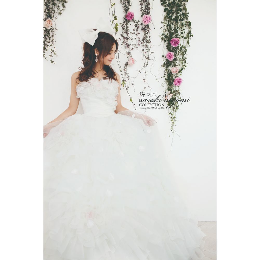 大胆な巻バラのスカートにチュールをを重ね、優しい表情のドレス。