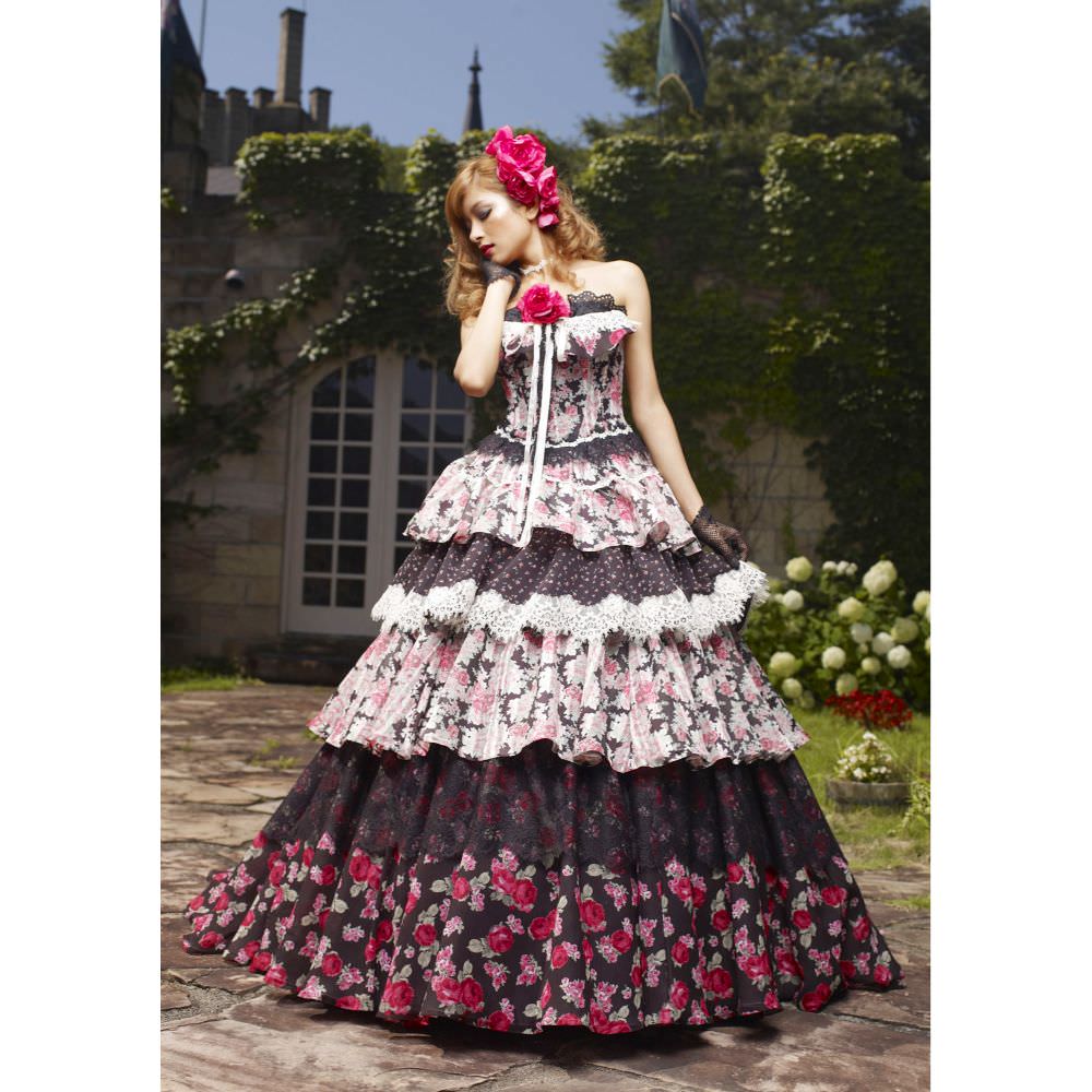 絵画を思わせるような上品な花柄をベースに小花柄~シックな赤のバラのティアードがとても魅力的なドレスです。