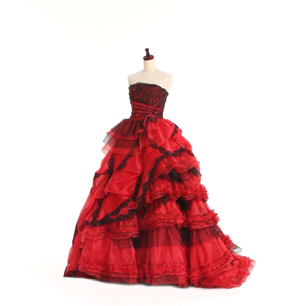 強めの赤と黒を組み合わせた存在感のあるタッキング&ティアードで大胆に仕上げた迫力の1着。