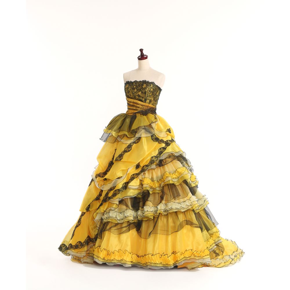 強めのイエローと黒を組み合わせた存在感のあるタッキング&ティアードで大胆に仕上げた迫力の1着。