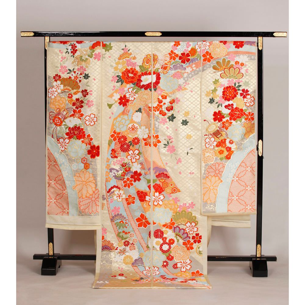 クリーム色地に牡丹や桜などの花々が散りばめられ、赤、オレンジ、ピンク、水色などかわいい色使いが、上品で愛らしい色打掛。